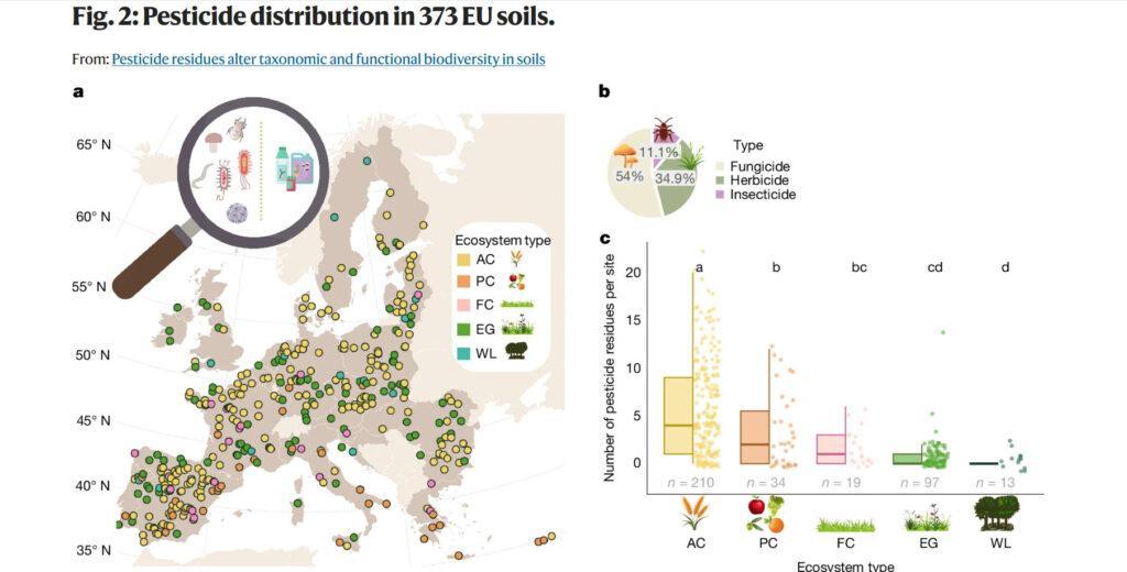 El 70% de los suelos europeos están contaminados por pesticidas que afectan significativamente a la vida en ellos y su diversidad. Pesticide residues in soils affect soil taxonomic and functional biodiversity, un estudio internacional que acaba de ser publicado en la prestigiosa revista Nature, proporciona, por vez primera, evidencias cuantitativas de la prevalencia y el impacto de los pesticidas usados en agricultura en los suelos europeos.