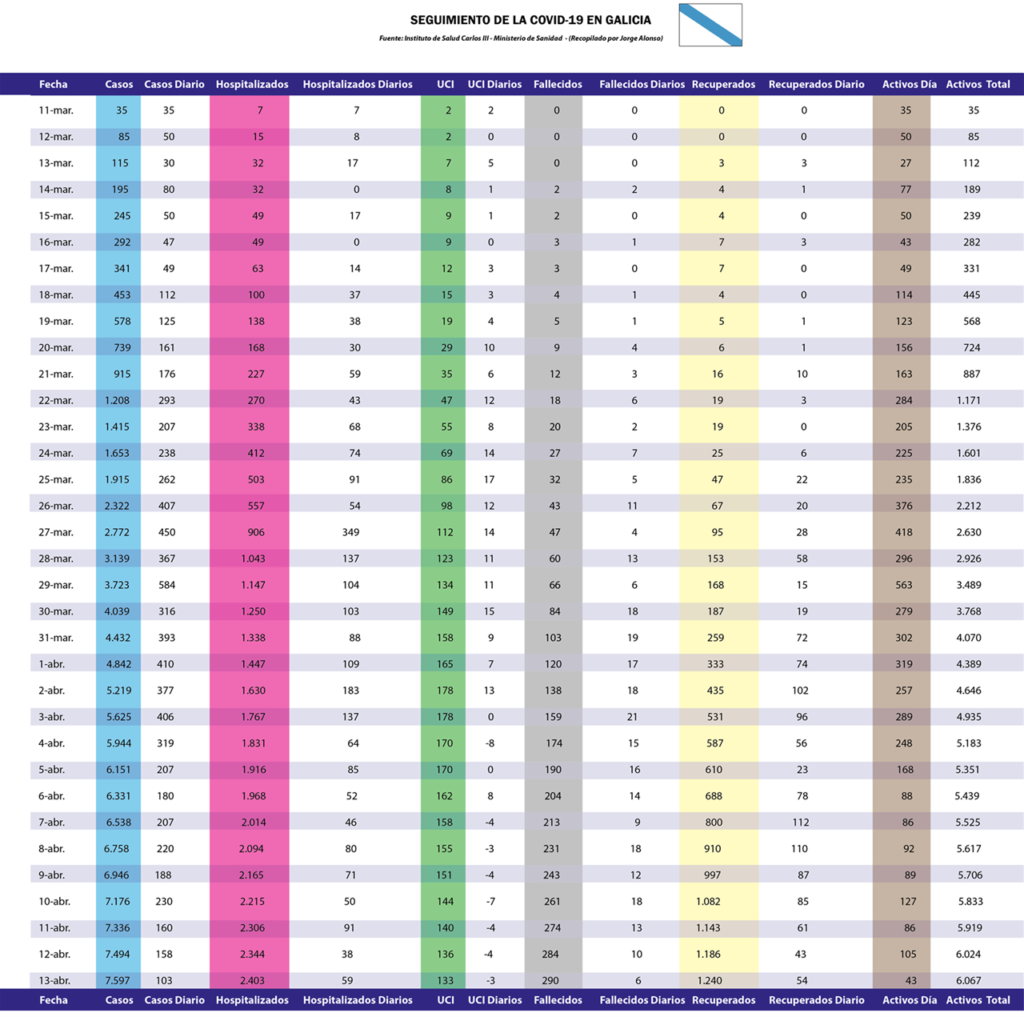 Respecto de como afrontar o proceso de desescalada, o equipo investigador alerta de que “non podemos pasar do confinamento á festa dun día para outro, ten que ser progresivo e tentar evitar que se produzan novos brotes internos». No que respecta á situación en Galicia, valoran como unha vantaxe o feito de ser un territorio historicamente illado, xa que «a nosa xeografía e as dificultades de comunicación históricas -e que aínda se manteñen- xogou ao noso favor: a pandemia chegou máis tarde e puidemos aproveitar todo o coñecemento médico que se desenvolveu, por exemplo en Italia, para mellorar o tratamento dos pacientes. Iso redundou en que comezamos o illamento antes de ter unha propagación hipermasiva, en que os casos de UCI foron chegando pouco a pouco, e en que co coñecemento médico foi posible unha redución nos tempos de UCI que redundou en non saturar estas unidades».