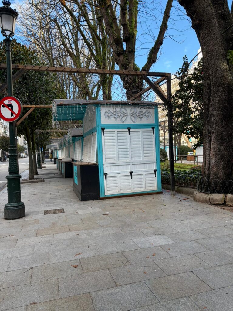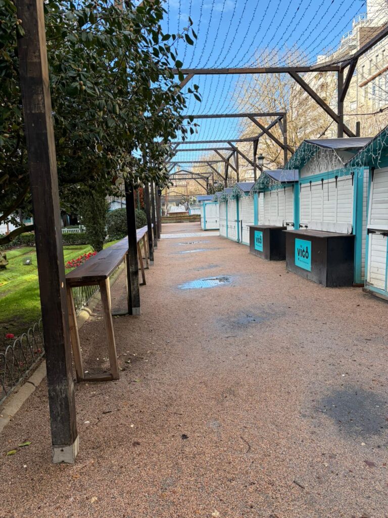 Diez días después del apagado oficial de las luces, los vigueses todavía no pueden disfrutar de la Alameda, que permanece ocupada por el Cíes Market, un mercadillo que desagrada a muchos de los vecinos de la zona y que entre montaje, Navidades y desmontaje, ocupa durante más de tres meses uno de los jardines más señeros de la ciudad.
