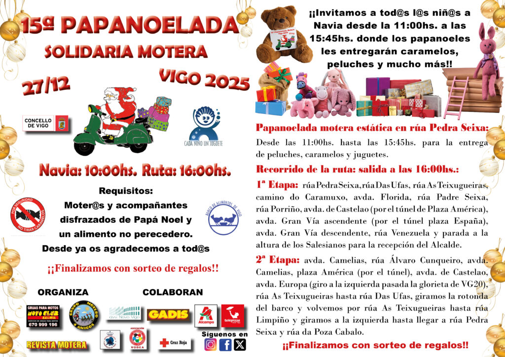 La caravana de Papá Noeles rodantes arrancará a las 16:00 horas para llevar la ilusión navideña a las principales arterias de Vigo. La ruta se ha dividido en dos secciones para maximizar la visibilidad a lo largo de la urbe. La ruta partirá de la calle Padre Seixas y enfilará el recorrido a través de Rúa das Ufas, Teixugueiras, Camiño do Caramuxo, Avenida Florida y un tramo de vuelta por Padre Seixas. Desde allí, continuará por la calle Porriño y la Avenida Castelao, utilizando el túnel de Praza América para conectar con Gran Vía. El ascenso por Gran Vía (incluyendo el túnel de Plaza España) se revertirá en el descenso hasta la calle Venezuela.