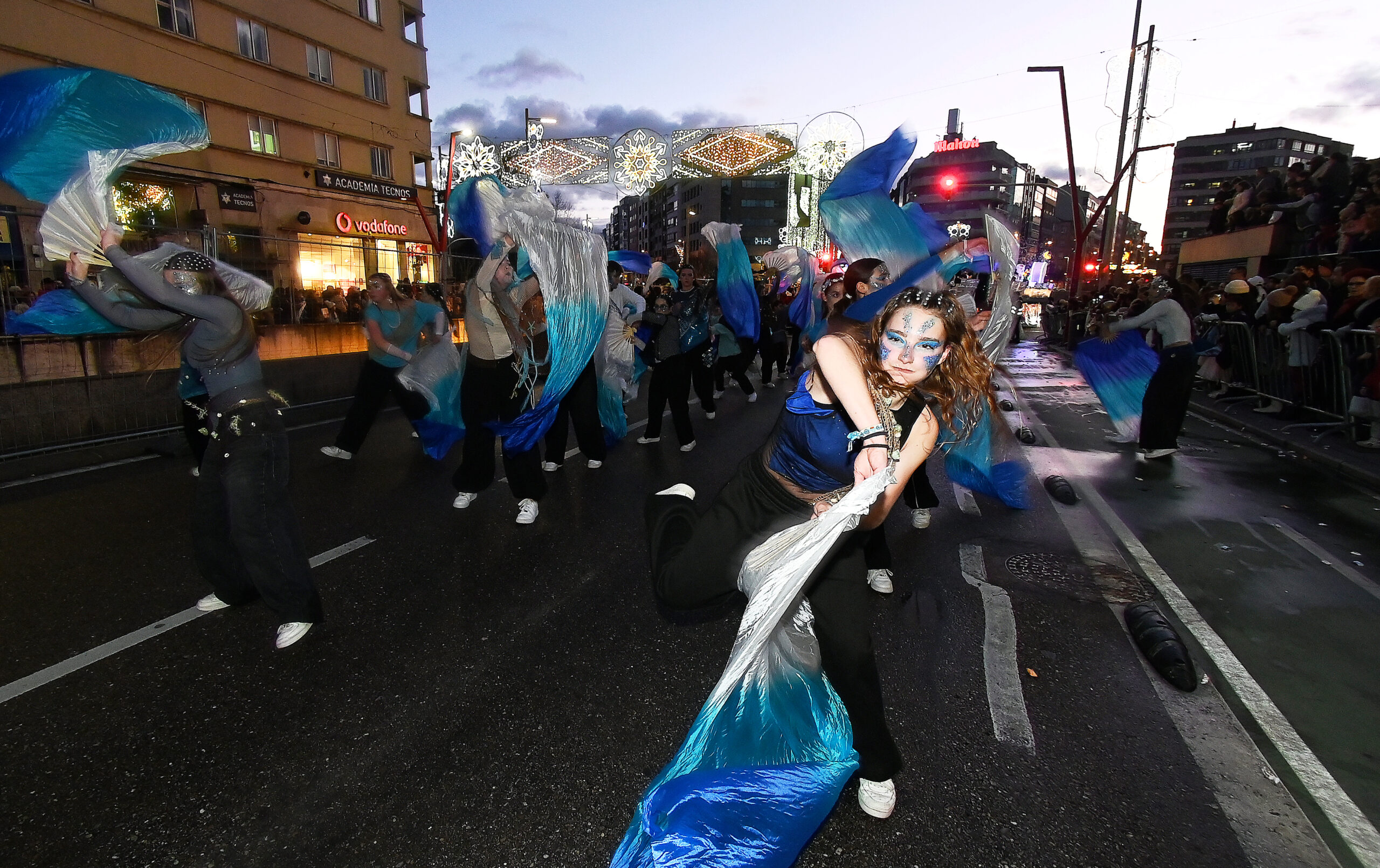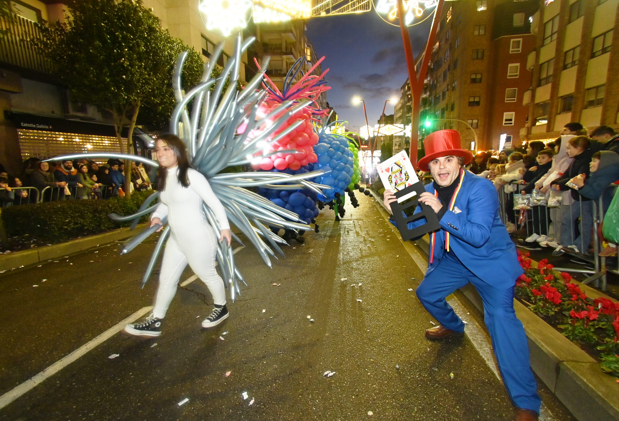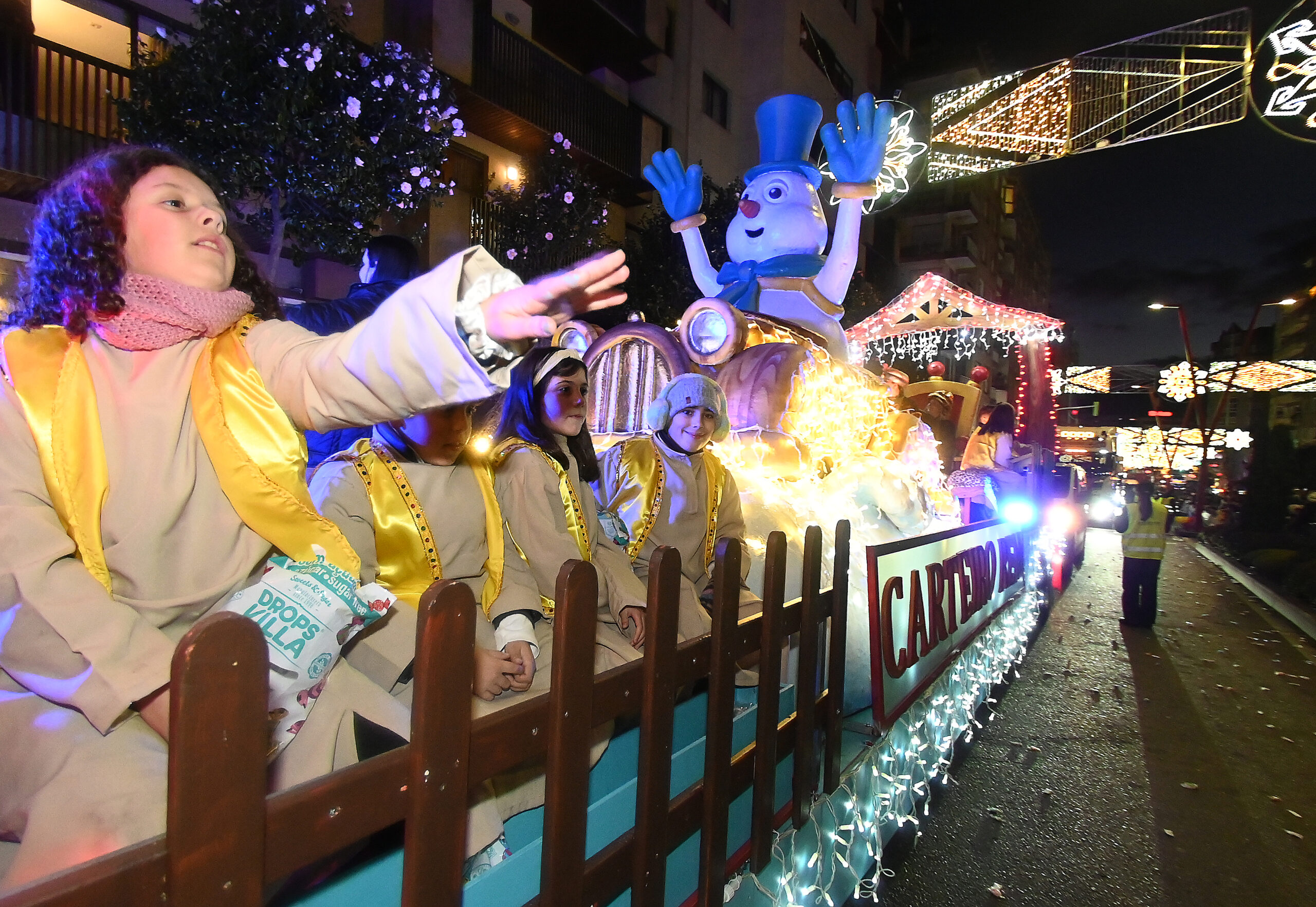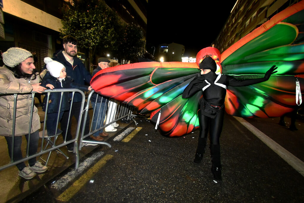 Abrían paso unos singulares papagayos motorizados (gracias a la tracción humana), una declaración de intenciones de lo que sería esta edición: una apuesta por el movimiento y la animación constante. El desfile avanzó con paso firme, integrando seis carrozas municipales (destacando la de la Policía Local y el Cartero Real) junto a las carrozas reales de Melchor, Gaspar y Baltasar.
