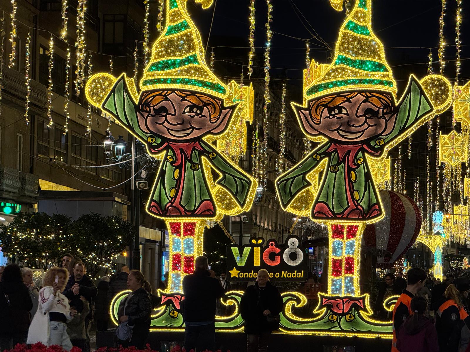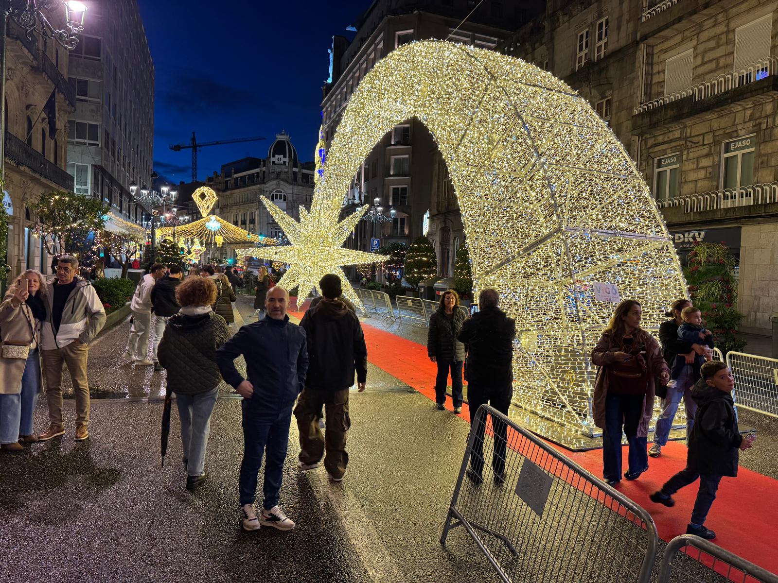La Navidad de Vigo ya está aquí. Y por fortuna, en esta ocasión, sin multitudes ni colapsos. Tampoco noria, cuyo montaje finalizará en los próximos días. La primera jornada de luces en el centro de la ciudad se saldó con buena afluencia pero sin agobios.
