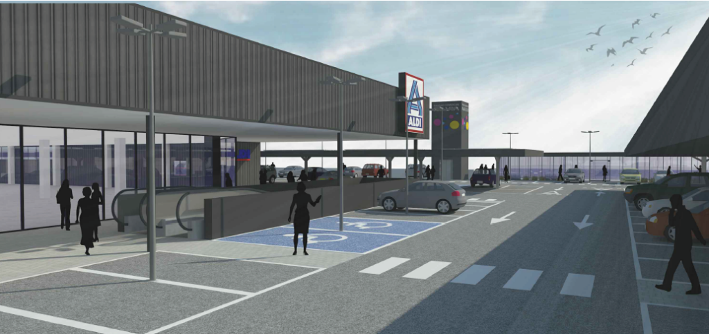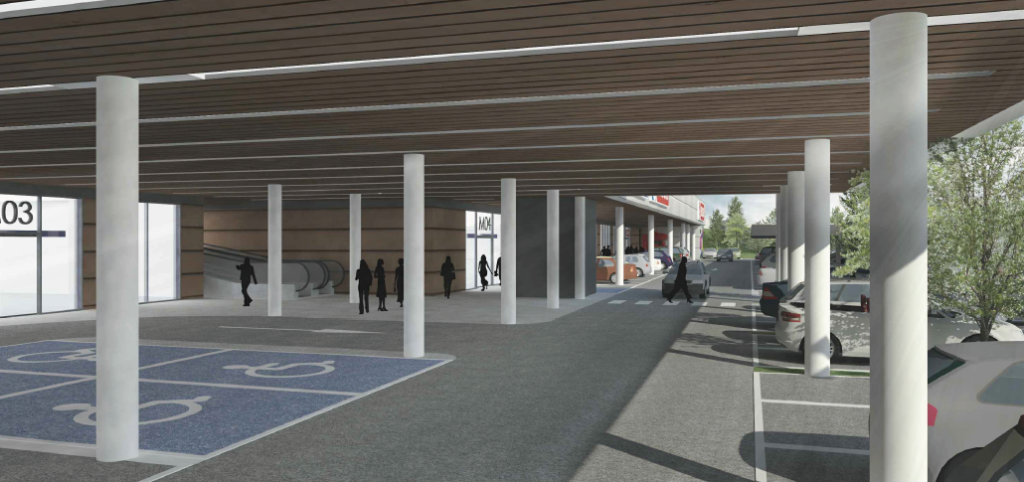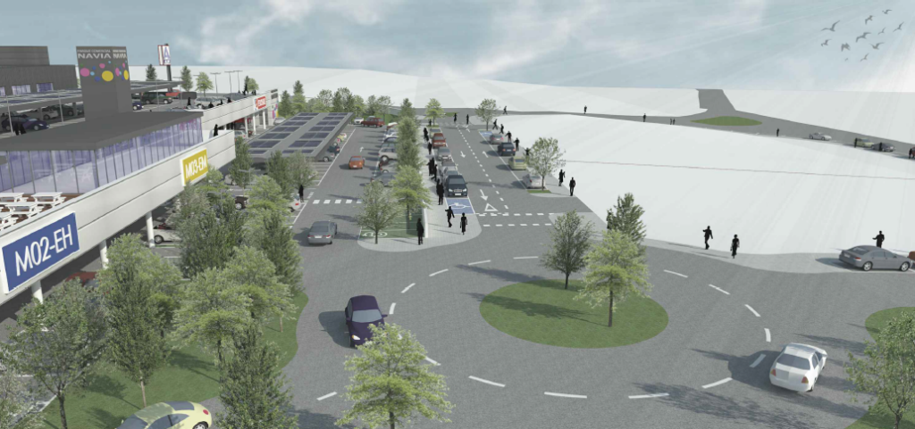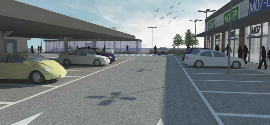 En este caso, las fachadas principales de los bloques de edificación se orientarán al parking interior sobre la cubierta del nivel 0, quedando así «en posición enfrentada entre sí para una lectura fácil y cómoda de las enseñas comerciales desde el aparcamiento común», destacan los redactores del proyecto. De este modo, las fachadas posteriores de las mismas quedarán para salidas de emergencia y accesos de carga y descarga de mercancías.