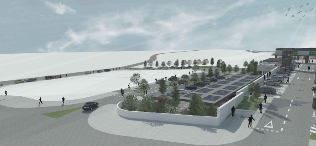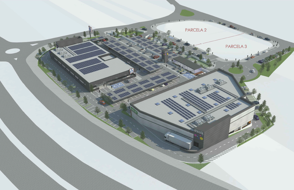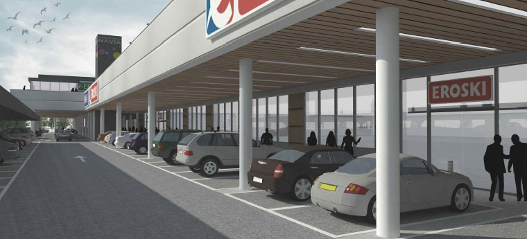Los arquitectos resuelven así el diseño emplazando las edificaciones comerciales sobre el fondo norte de la parcela creando, como definen, «una gran fachada-escaparate al viario de nueva creación y con acceso desde el mismo al aparcamiento», subrayan.