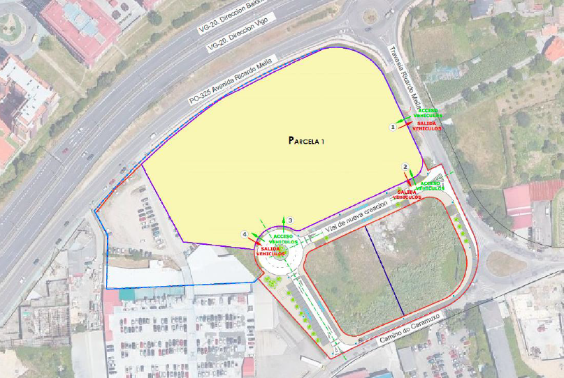En lo que concierne al tráfico y movilidad, y concretamente a los accesos y salidas previstas para la implantación comercial, la propuesta planteada permitirá un tráfico fluido articulando en la trama urbana un nuevo vial que sirve de elemento de transición entre el suelo industrial de Caramuxo y el residencial de Navia, «optimizando la funcionalidad del ámbito» y, desde el cual, establece tres accesos rodados a la parcela en nivel 0 desde el viario interior de nueva creación (exterior a la parcela 1), que aliviarán la densidad circulatoria de Ricardo Mella y que darán servicio tanto al aparcamiento situado en este nivel como a los muelles de mercancías, coexistiendo por tanto los accesos y salidas de vehículos y de camiones.