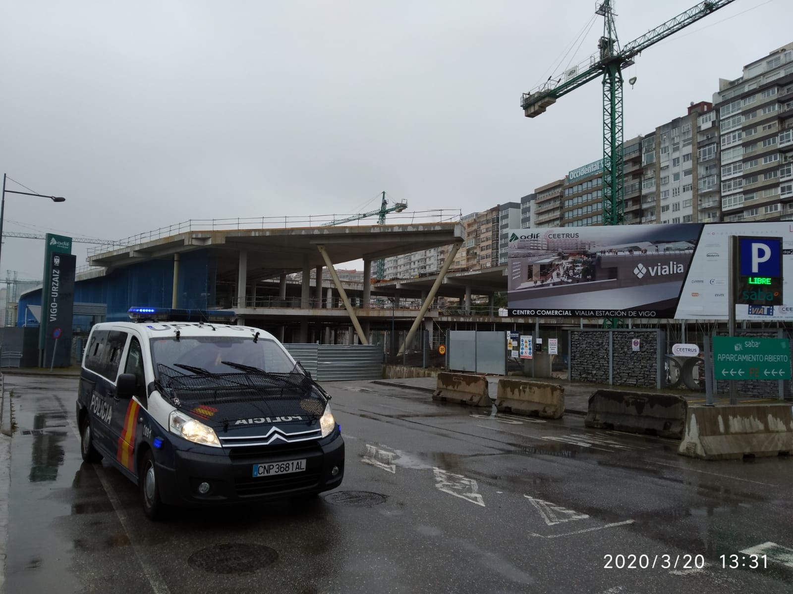 Agentes de la Policía Nacional patrullan las calles de Vigo, aeropuerto, estaciones de autobuses y de Renfe en colaboración con Policía Local y Brilat. «Pretendemos poner un poco de cordura a quienes no son solidarios y salen a pasear olvidado el daño que pueden hacer a los más vulnerables», señala la Comisaría en un comunicado.