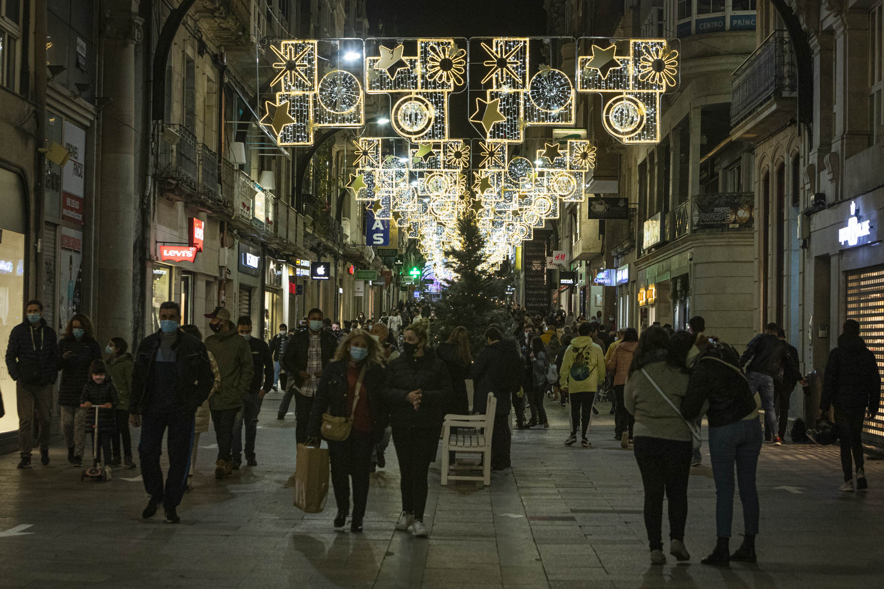 Así pues, la pandemia sólo permitirá disfrutar de las luces de Navidad de Vigo durante cuatro horas y media, de 18.00 a 22.30 horas. Este jueves 3 de diciembre será la primera jornada completa con el alumbrado activado después del acto de encendido celebrado este miércoles a las 20.00 horas. Se espera que Vigo salga a la calle para deleitarse con el despliegue lumínico de este año pero la previsión de lluvia puede condicionar el desembarco en el centro.