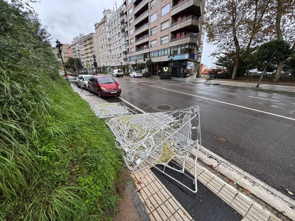 Amanecieron tumbadas en la calle Camelias, junto a la falda de O Castro, desprendidas de su tendido, donde en cuestión de un par de semanas les tocará brillar. Corresponderá ahora a los operarios de Iluminaciones Ximénez devolverlas a su lugar original.