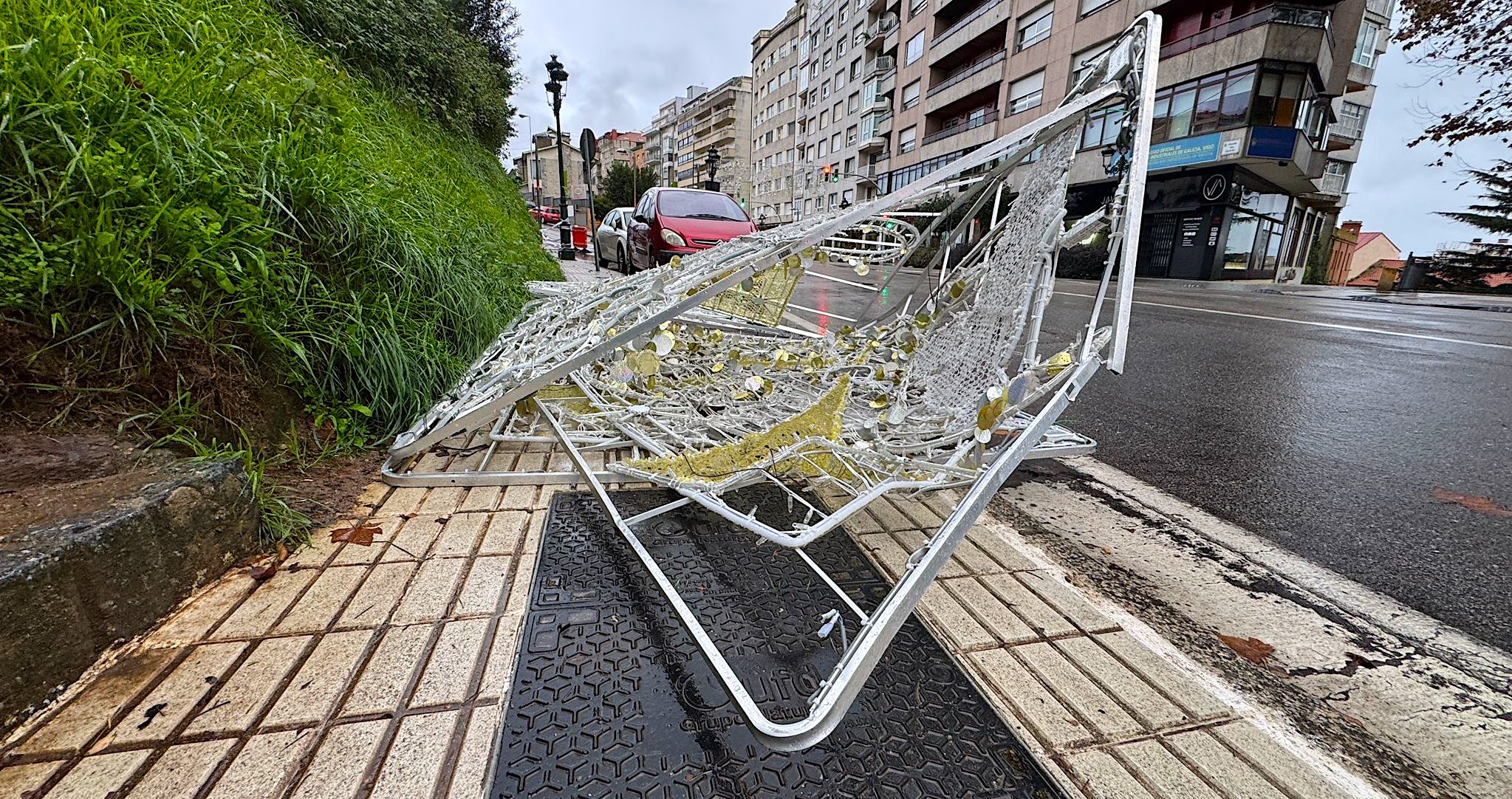 Amanecieron tumbadas en la calle Camelias, junto a la falda de O Castro, desprendidas de su tendido, donde en cuestión de un par de semanas les tocará brillar. Corresponderá ahora a los operarios de Iluminaciones Ximénez devolverlas a su lugar original.