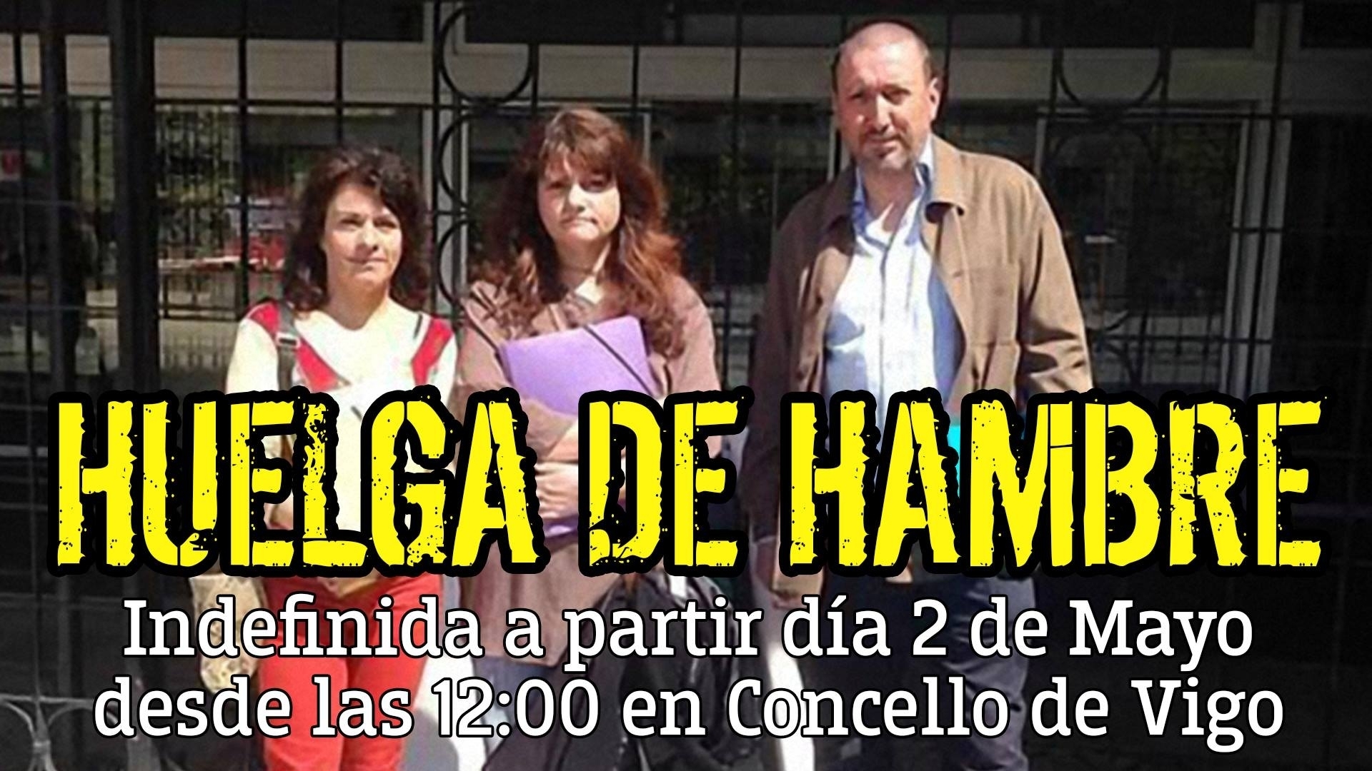 «Las tres familias con hijos de Vigo con fecha de desahucio inminente de Merchi, Isabel y Ricardo, tras las negativas reiteradas del alcalde de recibirles para solucionar su delicada situación, comenzarán una huelga de hambre indefinida el lunes día 2 de mayo a las puertas del Concello de Vigo para denunciar su situación y la de otras muchas familias que necesitan alternativa habitacional al no tener ingresos suficientes para asumirlas».