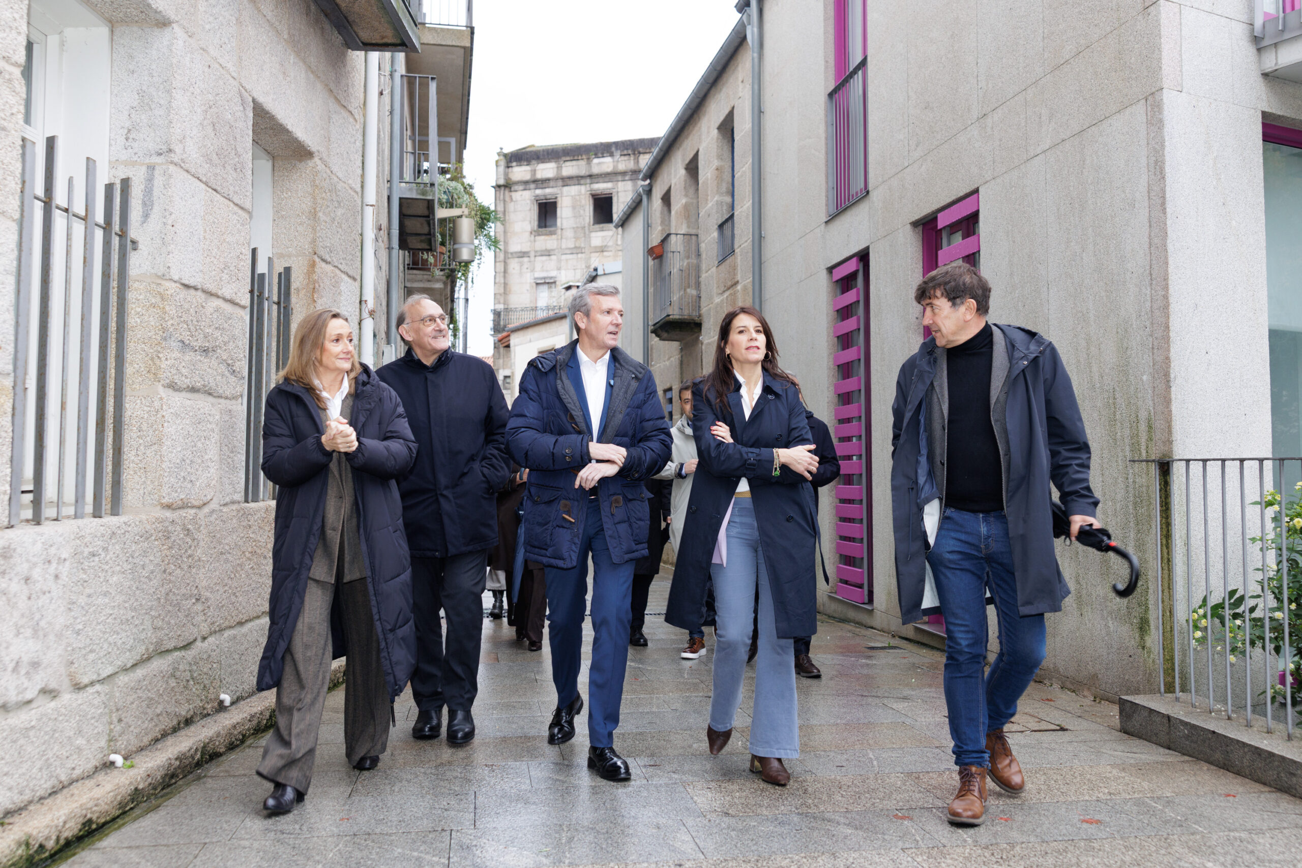 Un trabajo que, previamente al acto celebrado en el edificio Redeiras, Alfonso Rueda tuvo ocasión de conocer acompañado de la conselleira de Vivenda, María Martínez Allegue, y de otros cargos institucionales, recorriendo las calles del barrio y parándose en algunos de los locales y viviendas que se recuperaron durante estos 20 años.