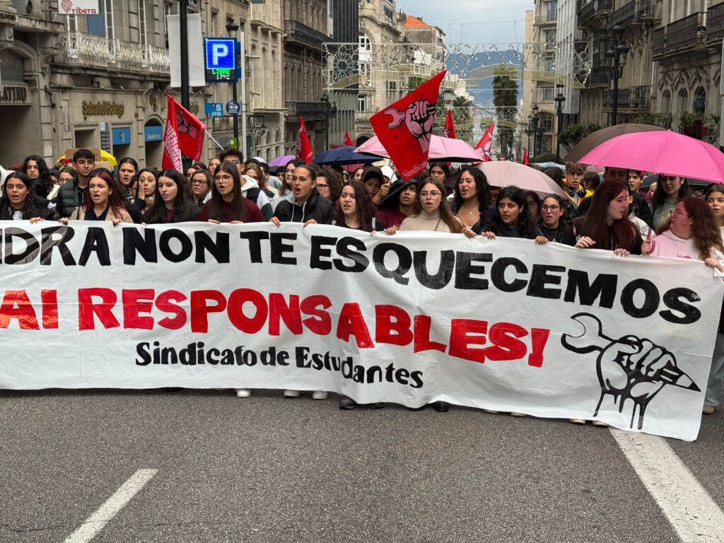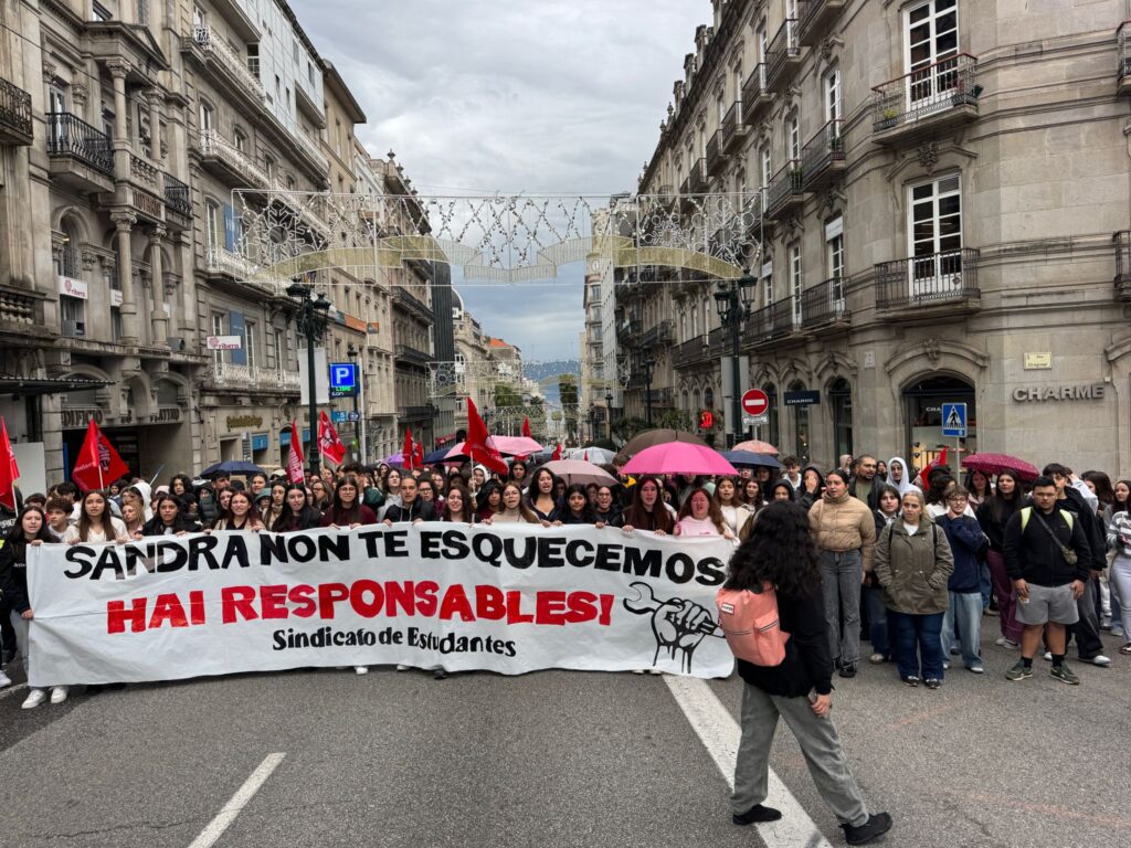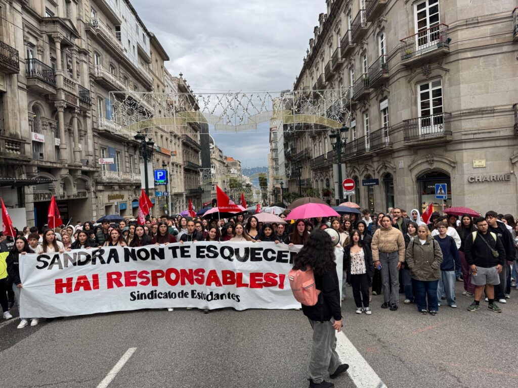 Bajo el lema «Sandra, non te esquecemos. Hai responsables», decenas de jóvenes recorrieron las calles de Vigo para acabar la concentración en La Farola de Urzaiz en una jornada de huelga estudiantil que se ha replicado en todo el país.