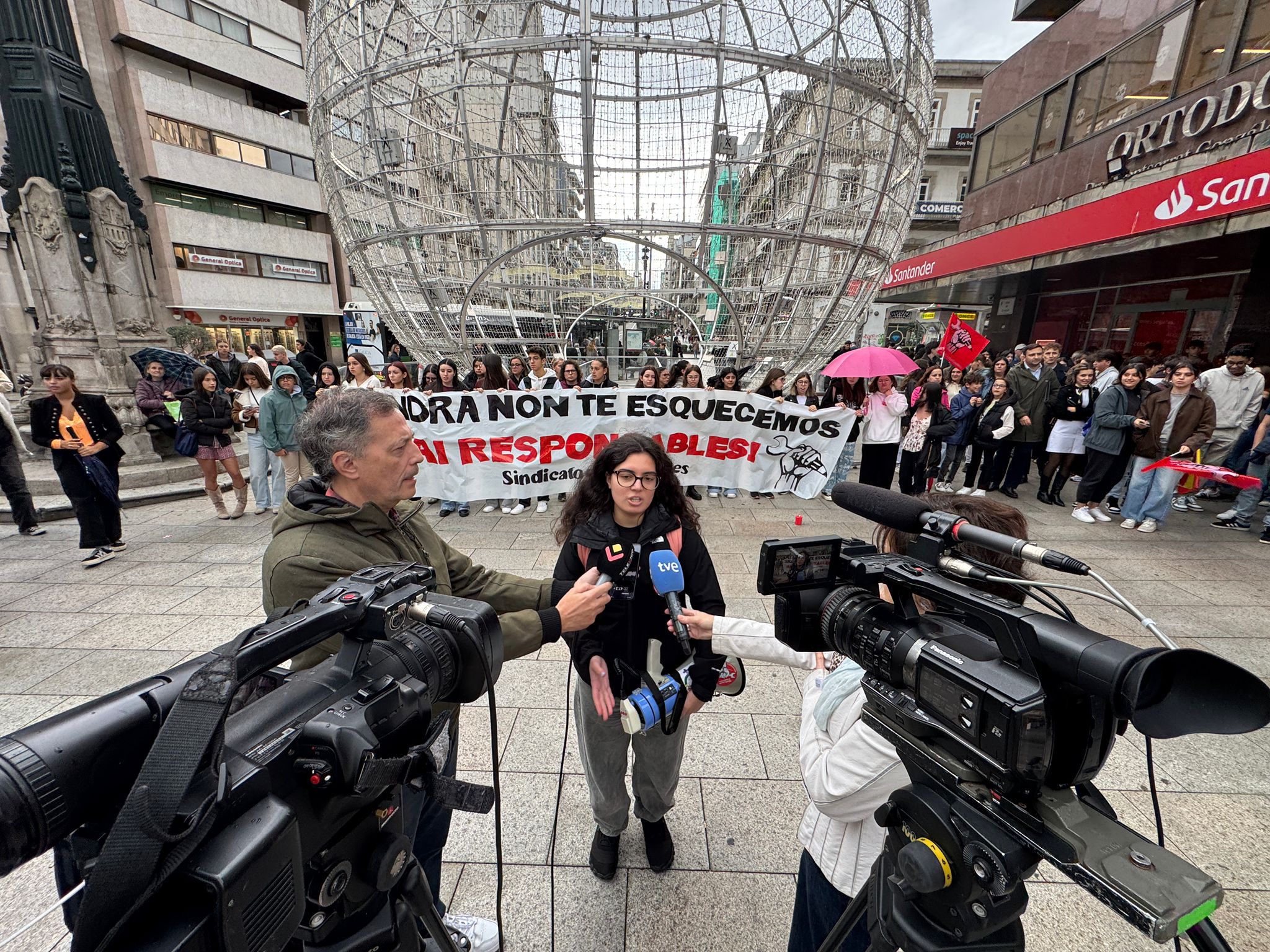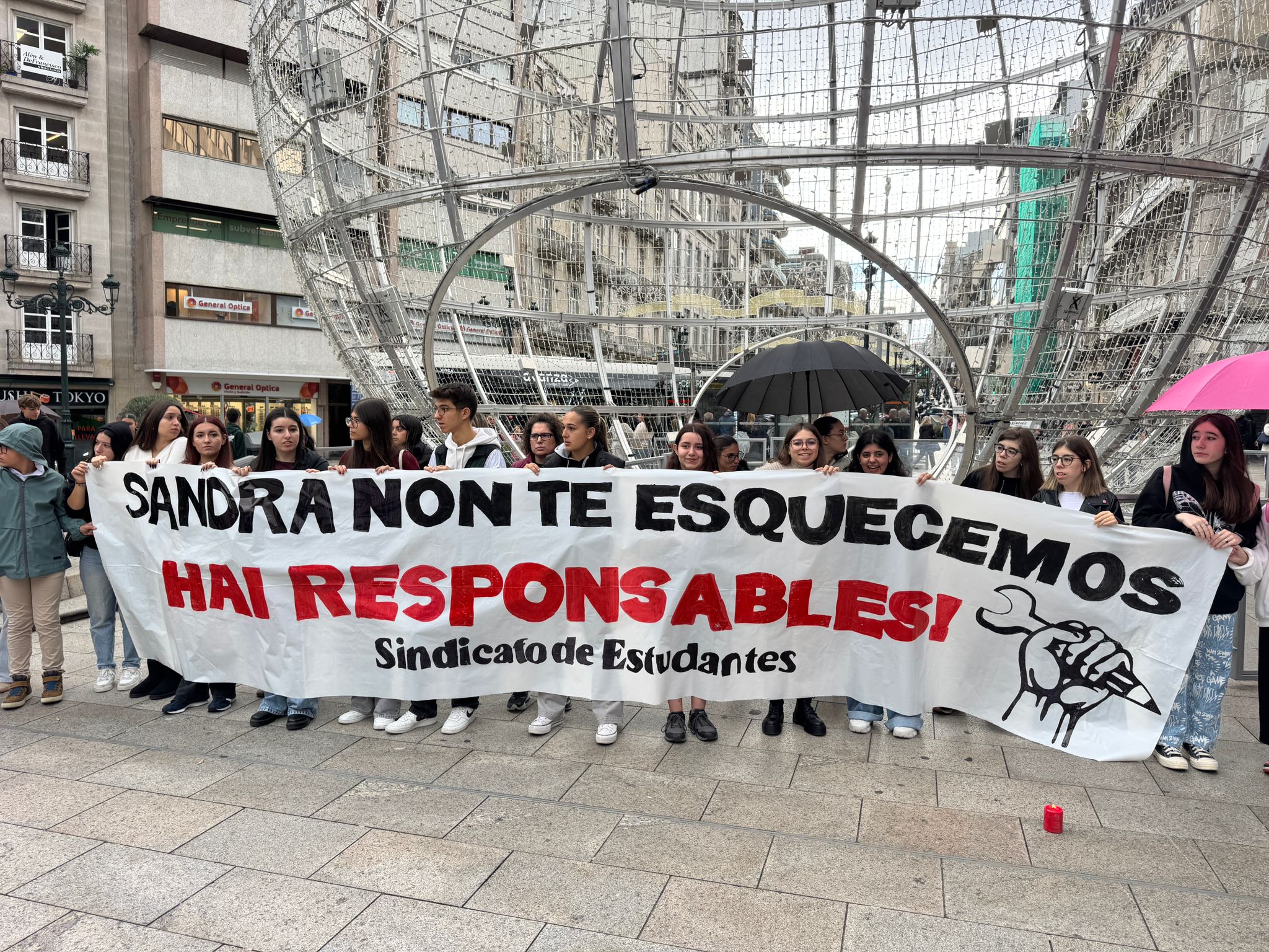 Bajo el lema «Sandra, non te esquecemos. Hai responsables», decenas de jóvenes recorrieron las calles de Vigo para acabar la concentración en La Farola de Urzaiz en una jornada de huelga estudiantil que se ha replicado en todo el país.