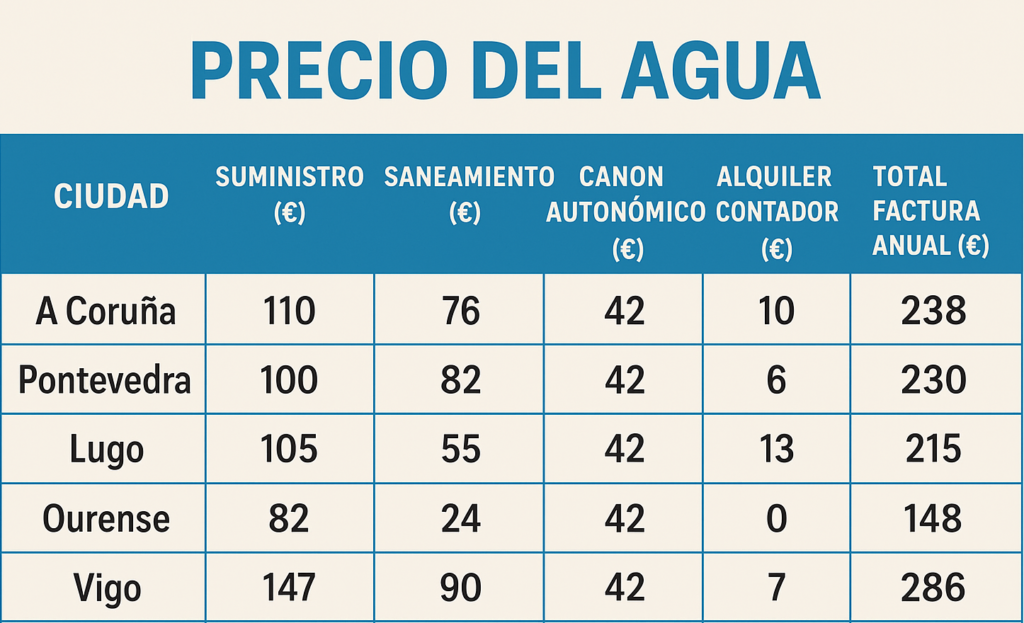 Los vigueses, por ejemplo, pagamos el agua más de un 50 por ciento más cara que los orensanos. Pero los coruñeses pagan 48 euros menos al año, los pontevedreses, 56 y los lucenses, 71. En el estudio no aparecen Santiago de Compostela y Ferrol, las otras dos grandes ciudades gallegas.