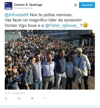Vas facer un magnífico líder da oposición. Viches Vigo hoxe e a @Pablo_Iglesias_ ????? pic.twitter.com/0p9Z5rgP7M— Carmen S. Queiruga (@CarmenSantosQ) 20 de septiembre de 2016