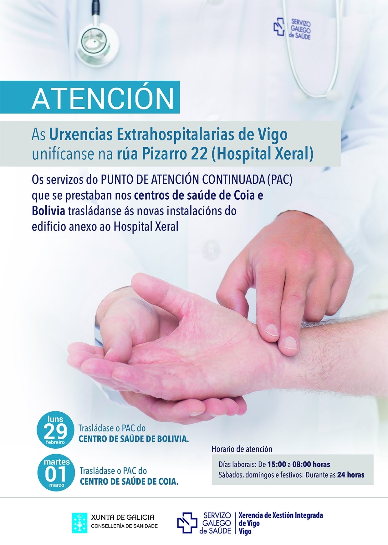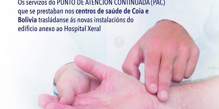 Y es que desde el próximo martes, 1 de marzo, los servicios del Punto de Atención Continuada que hasta ahora se prestaban en dos dispositivos, centro de salud de la calle Bolivia y en el barrio de Coia, se van a unificar en el edificio anexo al Hospital Xeral (Anexo II), calle Pizarro 22. En primer lugar, este mismo lunes se trasladará el PAC de Bolivia, y al día siguiente, el 1 de marzo, el de Coia.