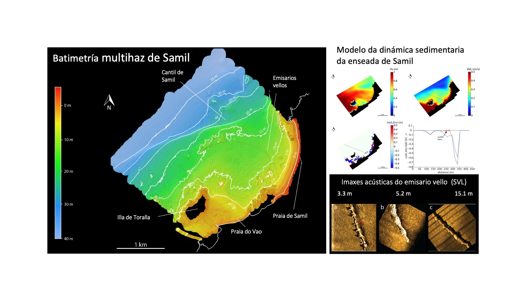 “O multihaz foi a base dun levantamento hidrográfico moi preciso que, xunto co cálculo do tamaño de grao do sedimento, permitiu modelizar como se produciría o transporte baixo condicións normais e extremas (tormentas) a partir de valores medios significantes das series históricas de ondada recollidas por Portos do Estado durante os últimos 30 anos”, explica o director do estudo. Ademais, estes datos tamén serviron para calcular a profundidade de peche da praia, que é a profundidade a que a area do fondo deixa de moverse estacionalmente. No caso dos datos do sonar de varrido lateral empregáronse para observar directamente as profundidades nas que a estrutura dos emisarios vellos estaban afectadas polas ondas e as correntes, causando procesos de erosión e sedimentación ao encontrarse co emisario.