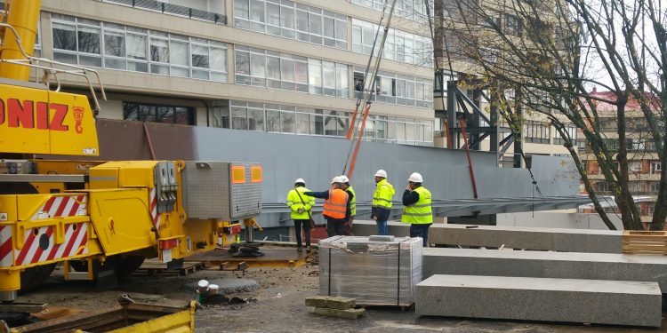De momento sólo se aprecian las estructuras, pero ya se puede intuir lo que será el paso elevado y esa conexión con ese futuro punto de encuentro para observar de lejos la ensenada viguesa. Ha costado horas pero finalmente los operarios han conseguido colocar la pasarela que llegaba al amanecer de este mismo jueves mediante transporte especial a la calle Pi y Margall. Allí, a mediodía, se erguía la pieza hasta incrustarla en su lugar.