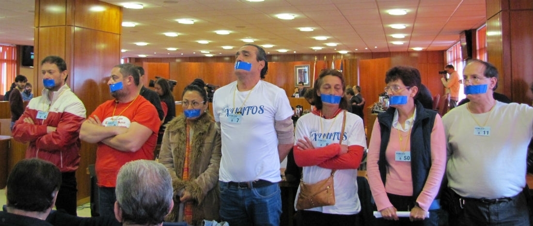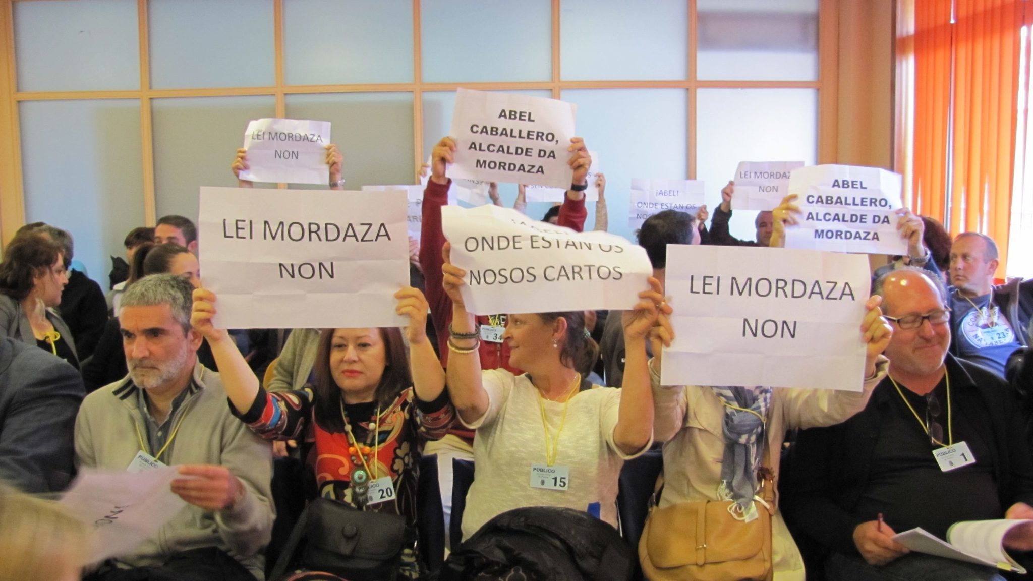 La sala se llenó con representantes de muy diferentes colectivos. Desde políticos, como BNG y Xuntos, hasta sindicatos, como CIG, pasando por trabajadores de Linorsa o parques y jardines. Con carteles de “ley mordaza” o “¡¡Abel!! As de Linorsa estamos sen cobrar”, las protestas fueron continuas desde que comenzó el pleno.