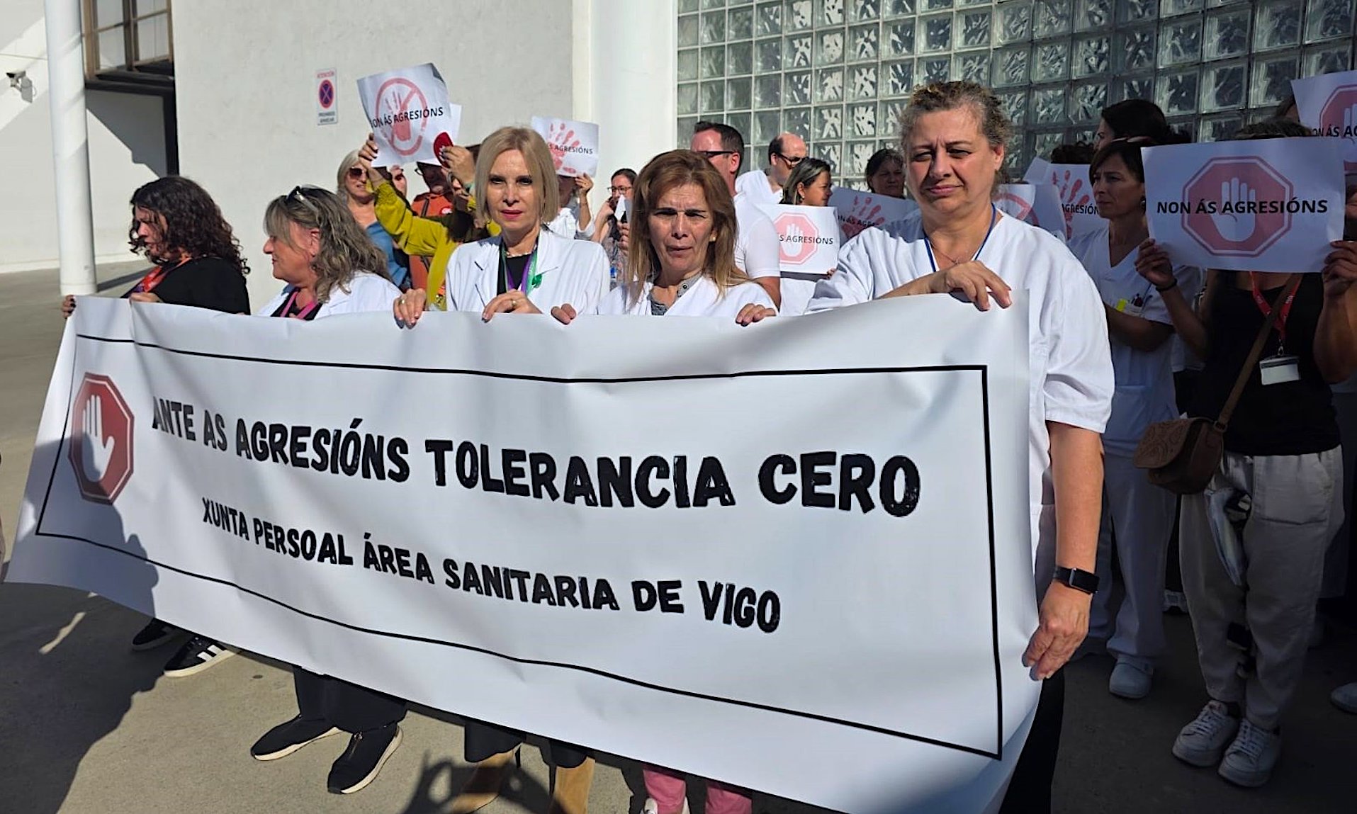 Profesionales sanitarios se han concentrado este martes ante la puerta principal del hospital Meixoeiro para denunciar una nueva agresión a una profesional, una enfermera de este centro, y para reclamar otra vez «tolerancia cero» y medidas preventivas ante este tipo de situaciones.