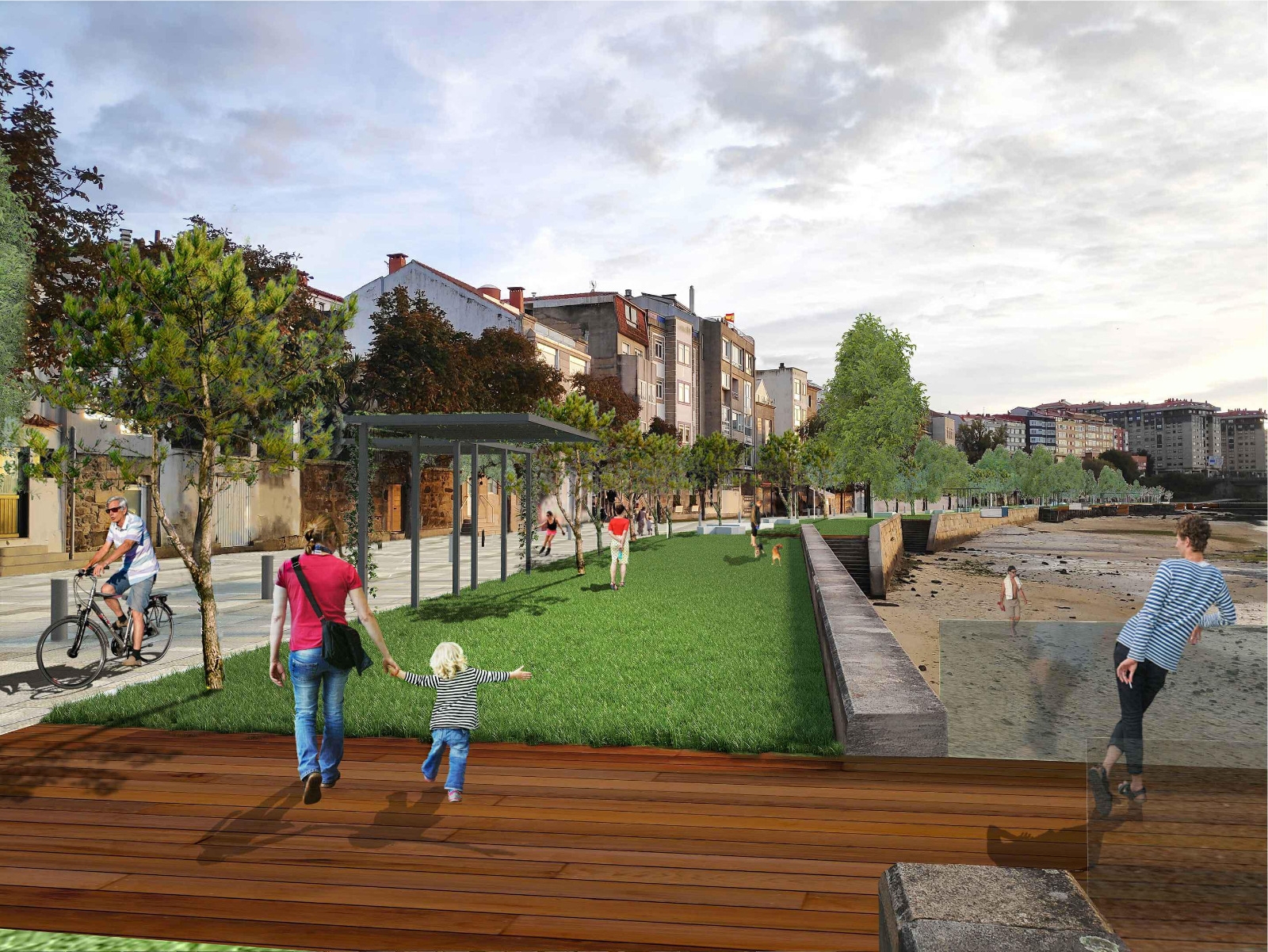 Na parte próxima aos edificios, manterase unha pequena franxa de granito, acorde aos edificios na superficie que abrangue ata a metade do paseo aproximadamente. Nesta zona, o Concello instalará iluminación vertical en todos os edificios e haberá unha gran novidade: onde estaba o paseo de madeira voladizo, que houbo que pechar polo seu deterioro, instalaranse bancadas de acceso ao mar. Trátase dunha zona duns 250 metros de bancada escalonada que permitirá tomar o sol e acceder ao mar. Segundo explicou Caballero, este deseño de escaleiras e gradas que “é unha revolución” foi tomado partindo do exemplo das praias fluviais do Sena.