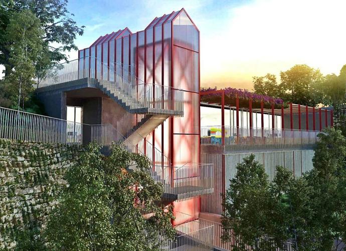 Este inmueble está situado en las inmediaciones de la pista deportiva, el parque infantil y la entrada al aparcamiento subterráneo de O Berbés. Allí se habilitará un pasadizo ancho con luz natural y artificial para luego entrar en el elevador –o seguir a través de escaleras- y subir hasta una futura área verde que prevé la urbanización del Barrio do Cura. Esta zona estará ubicada ligeramente por debajo del Paseo de Alfonso XII, aproximadamente a la altura de la estructura que se derribó junto a la escuela infantil municipal de Santa Marta.