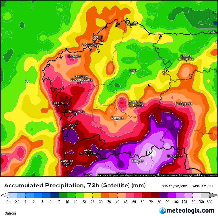 En la zona de las Rías Baixas y río Miño se esperan vientos del sur con rachas máximas de hasta 80 kilómetros por hora. También precipitaciones acumuladas de 40 litros por metro cuadrado en doce horas. En la costa, mar combinada del suroeste con olas de 4 a 5 metros desde el mediodía.