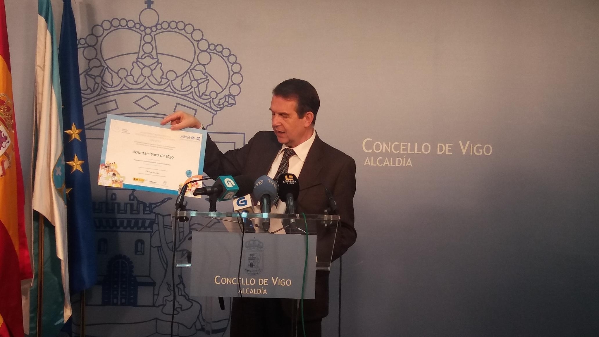 O alcalde de Vigo, Abel Caballero, deu conta este luns da entrega, por parte de Unicef, do premio do VIII Certame de Boas prácticas, dereitos da infancia e política municipal co que recoñece o «esforzo do Concello en favor da infancia». Así, destacou a atención ás nenas e nenos do seu goberno con políticas como as bolsas de inglés, as bolsas de libros e de comedor, das que se benefician ata 5.000 familias que non poden sufragar os gastos de estudos polas súas circunstancias económicas, a acción deportiva, os parques infantís ou o turismo familiar.