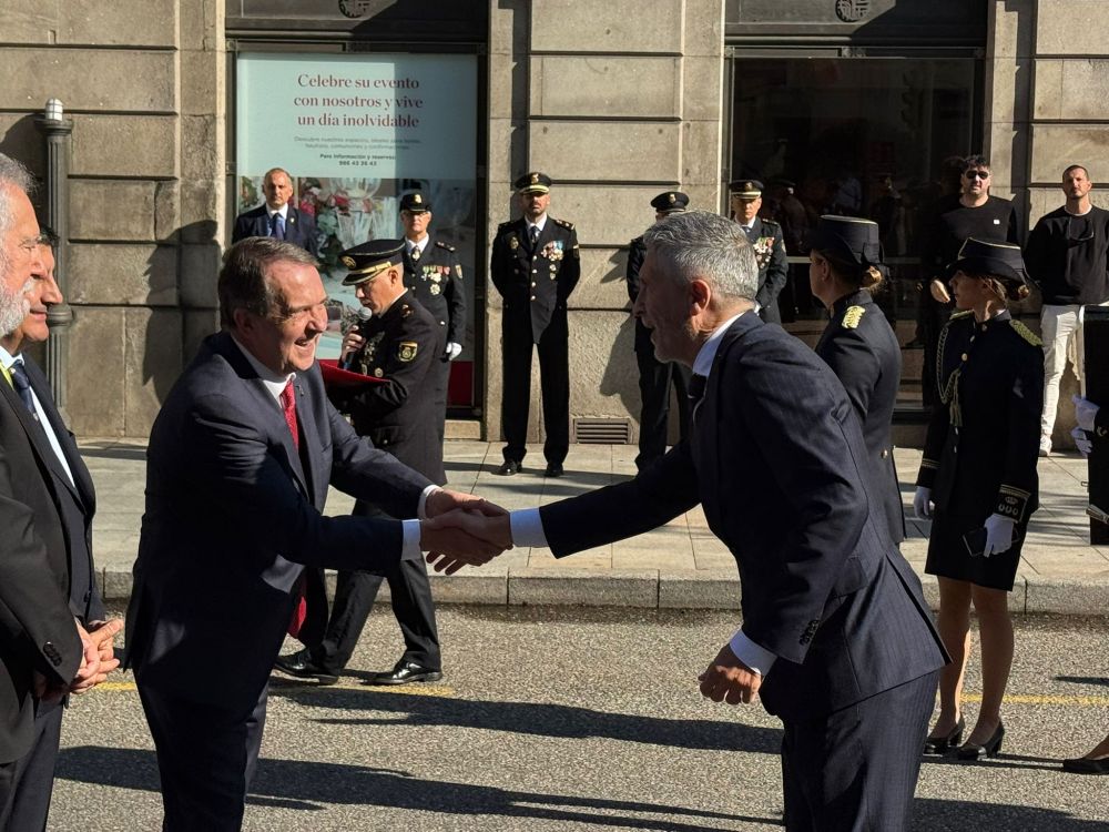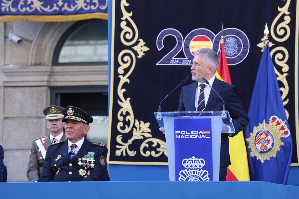 El encargado de continuar el acto ha sido el ministro Grande-Marlaska, quien ha reivindicado el «hito» alcanzado este año, con el «máximo histórico de efectivos» en el cuerpo, superando los 76.700 agentes de policía.