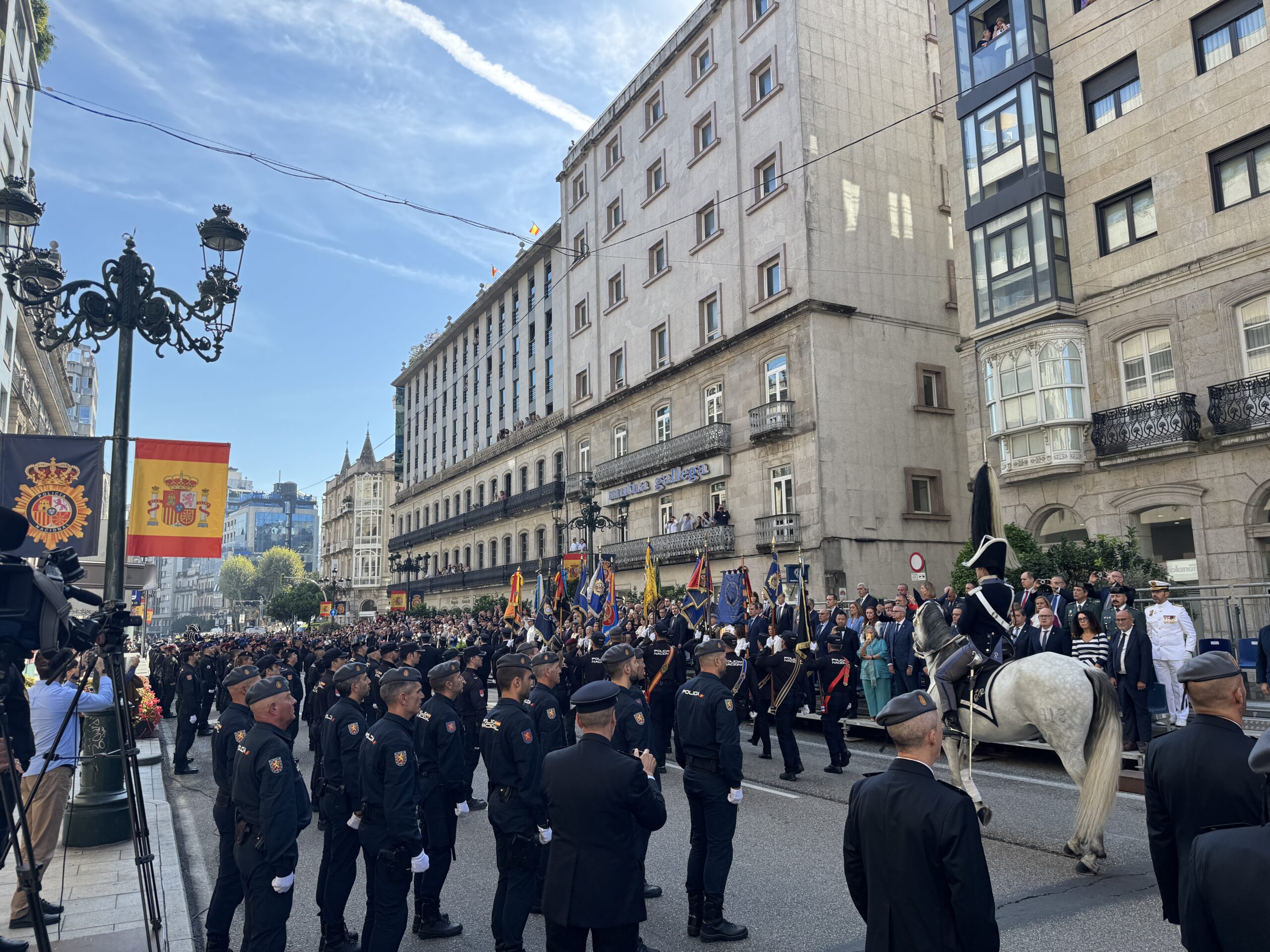 La ciudad de Vigo ha acogido este jueves el acto central del Día de la Policía Nacional, en honor a sus patronos los Santos Ángeles Custodios, reivindicado el «hito» de alcanzar su «máximo histórico de efectivos» con cerca de 76.700 agentes.