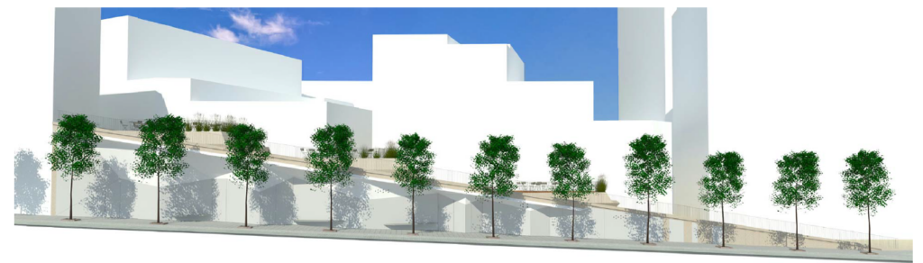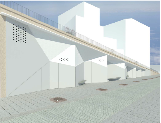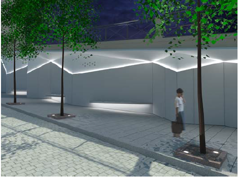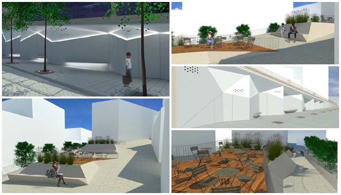 Mientras, la segunda ‘piel’ se centrará en el contacto con la cornisa existente con el objetivo de «enfatizar la iluminación lineal» de la parte superior. Y los espacios cóncavos que se generan resuelven así los nuevos accesos a los locales, que estarán «arropados» por unos bancos adosados a la fachada para ofrecer espacios de pausa y descanso.