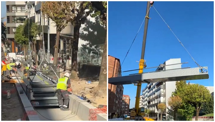 Las obras de las nuevas rampas mecánicas en Pintor Lugrís dieron este miércoles un importante avance con la colocación de los propios elementos de movilidad vertical.