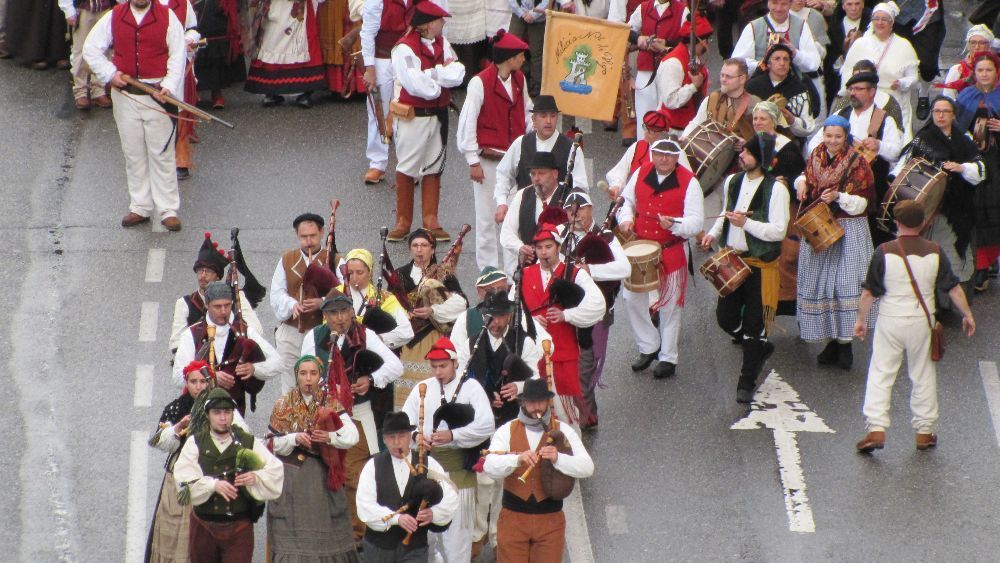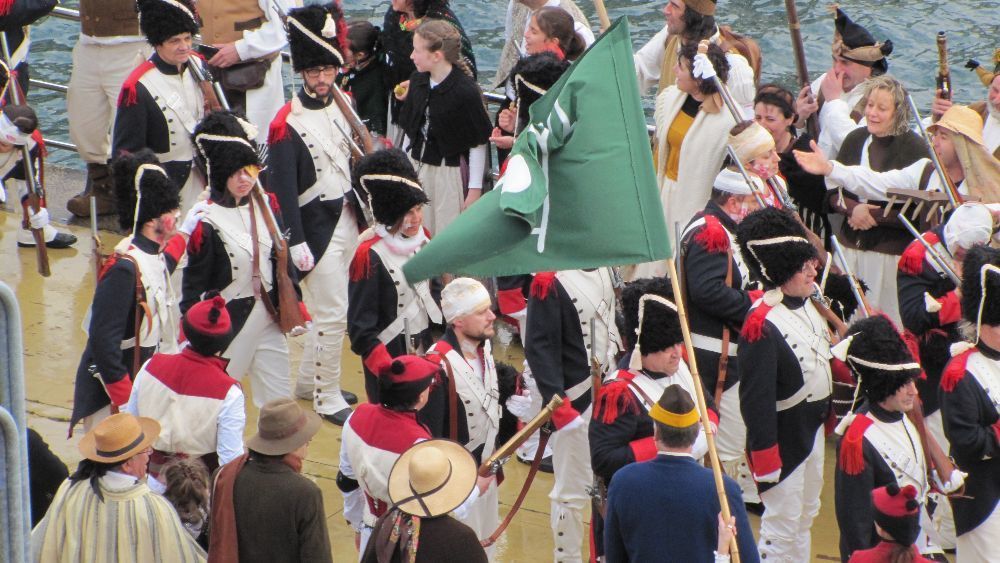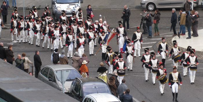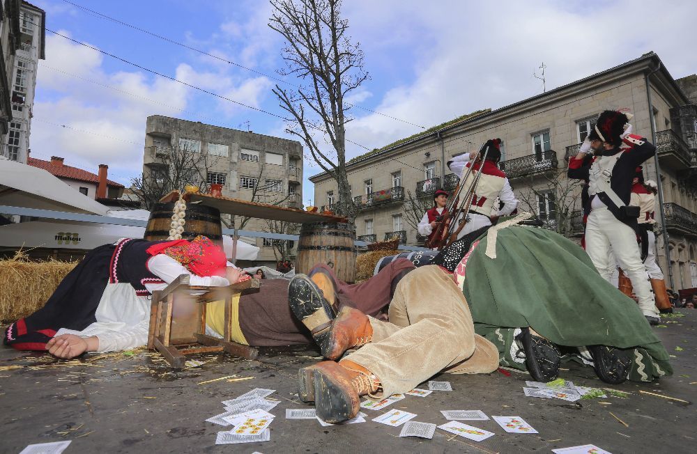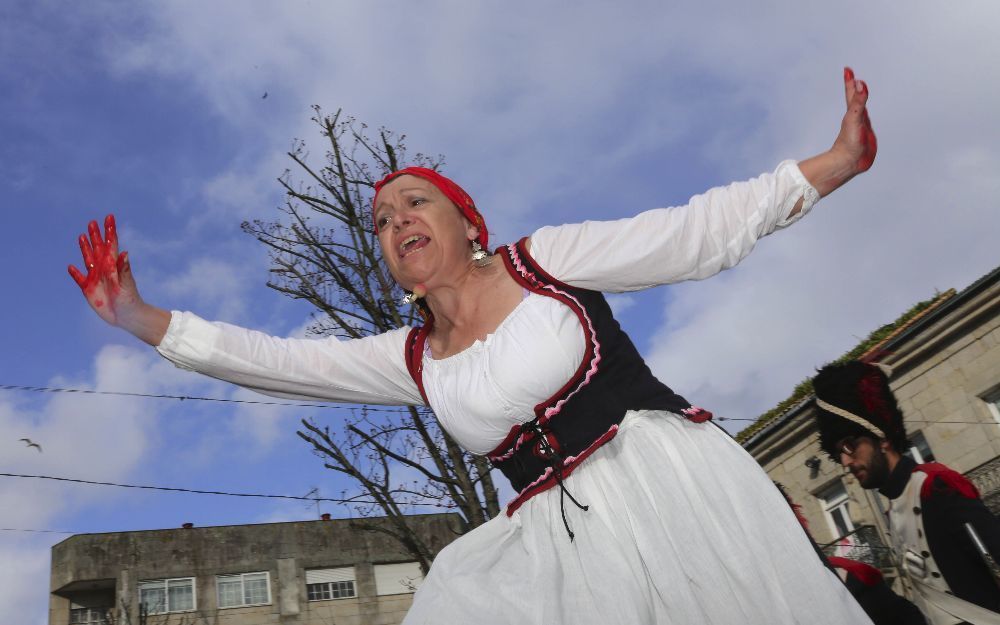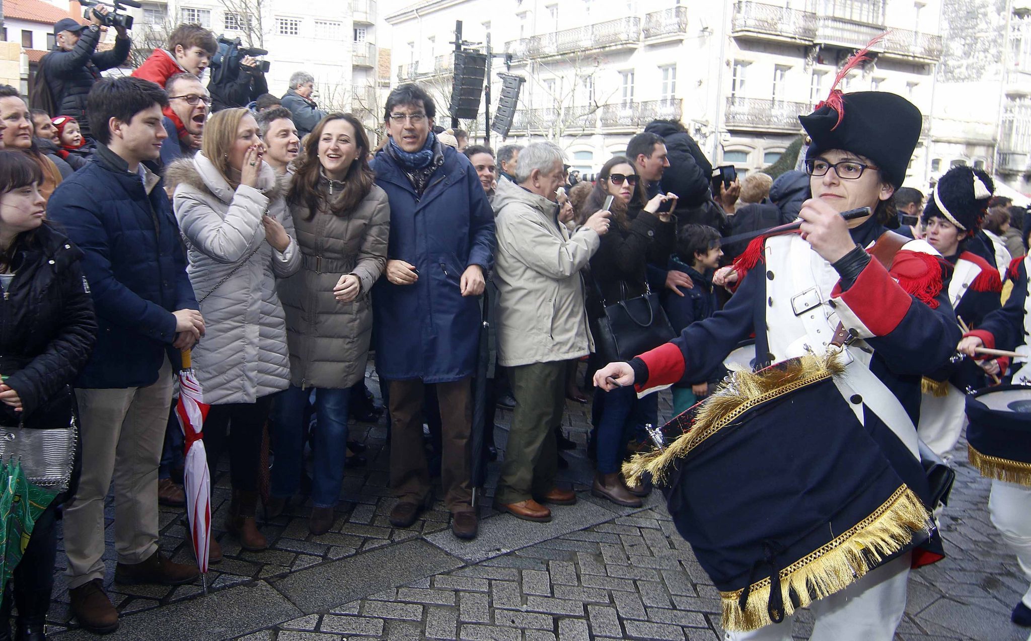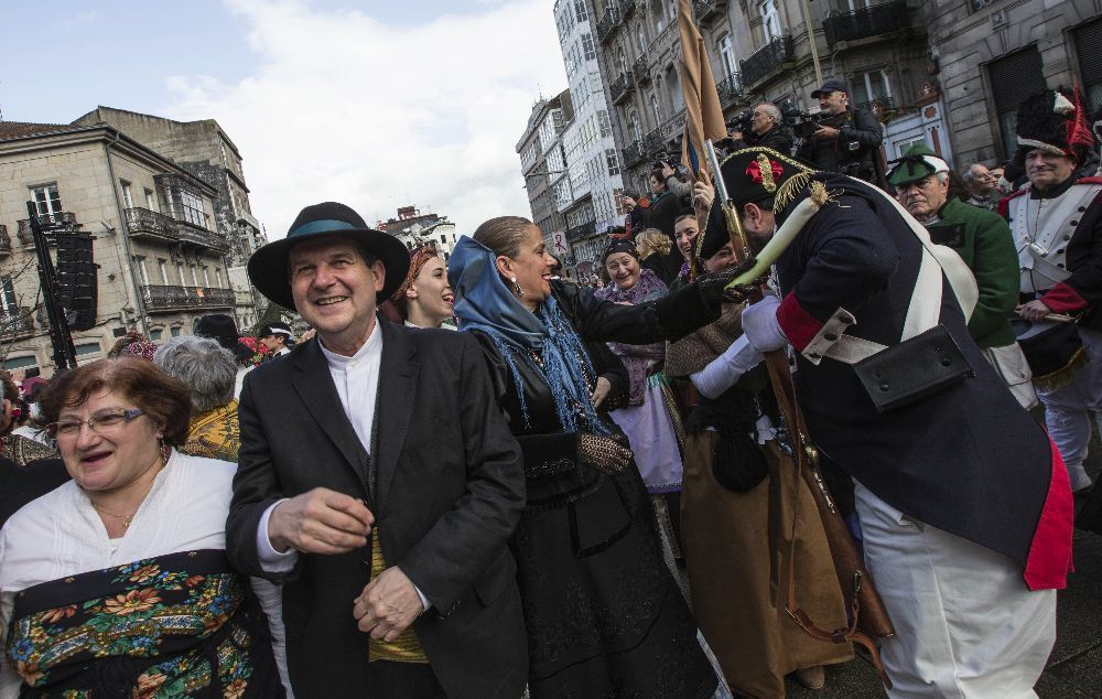 El músico ciego Casimiro abrió con su zanfoña la narración de la representación teatral. Mayores y pequeños ataviados de época se involucraron en la actuación y protagonizaron las primeras escaramuzas con las tropas de José Bonaparte. No podía faltar entre el gentío el alcalde Abel Caballero y un buen número de concejales.