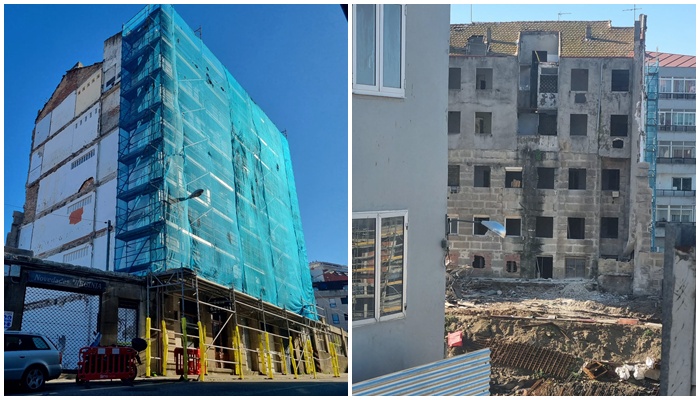 Así fue hasta principios de este mes de noviembre, cuando acabaron de sacar todas sus pertenencias y teniendo ya encima un andamio desde finales del mes de octubre, que se colocó para proteger la zona y el propio edificio debido a las vibraciones y perforaciones que la maquinaria de las obras del futuro complejo residencial estaban produciendo en el ámbito más cercano a Llorente y Santa Marta.