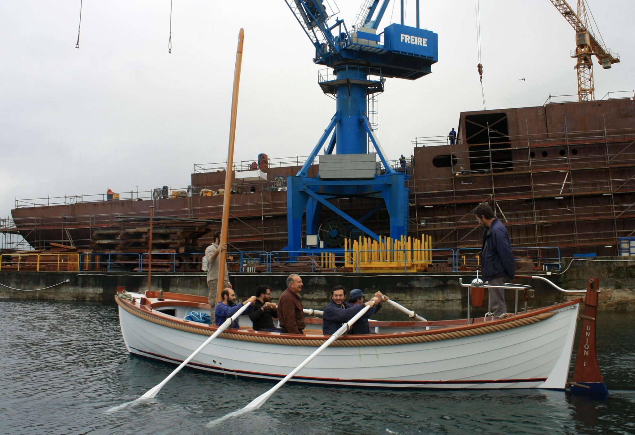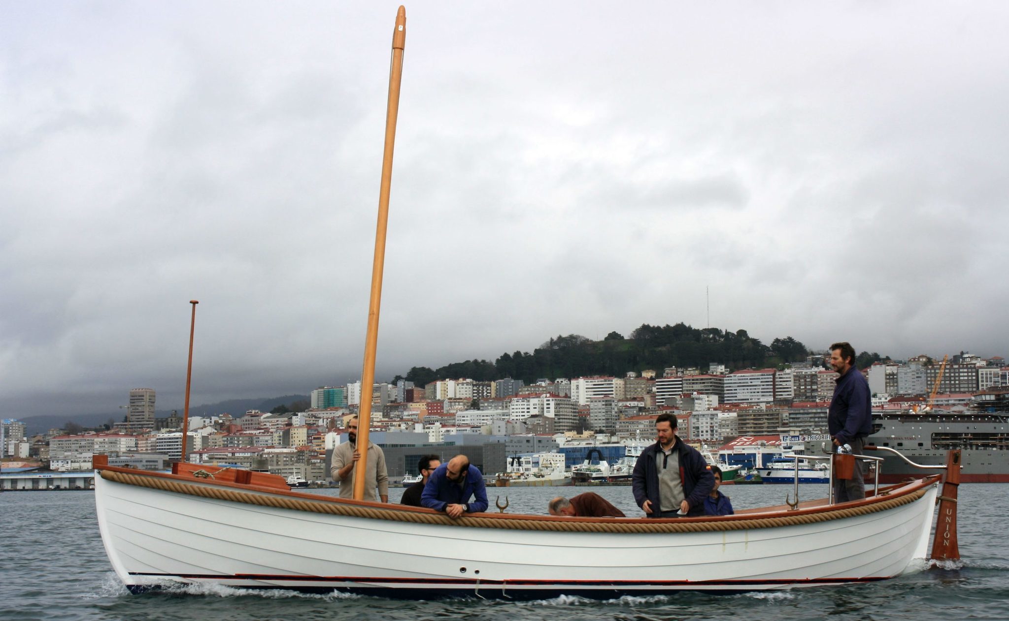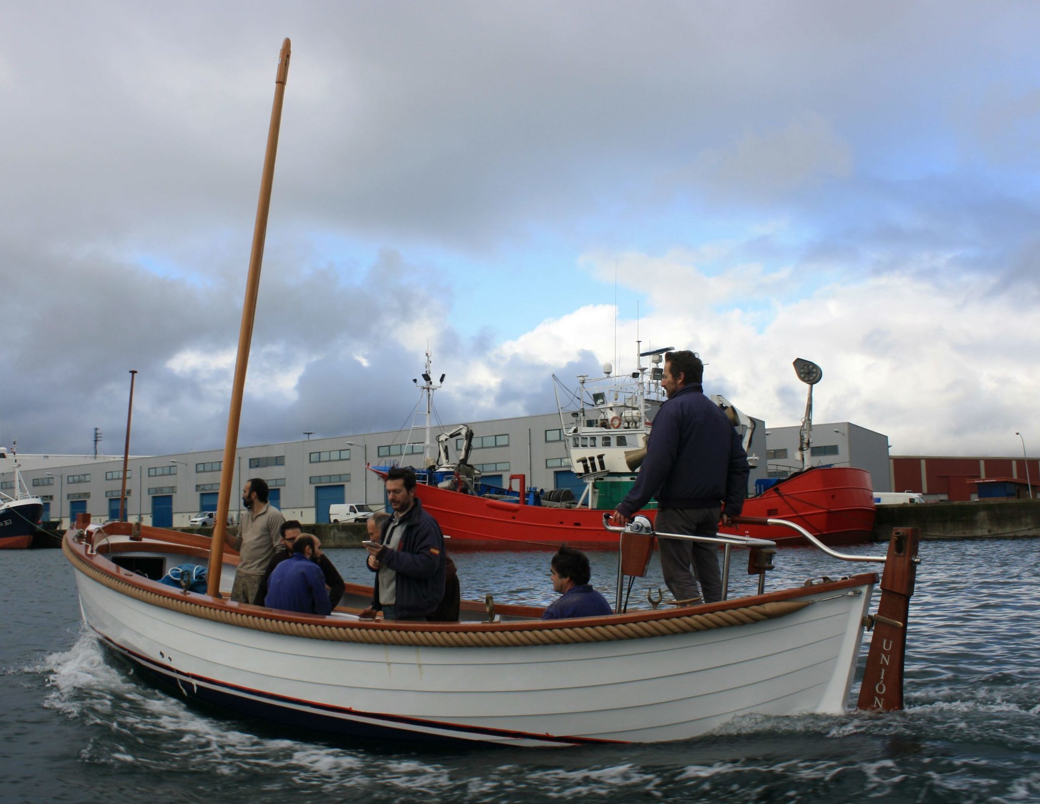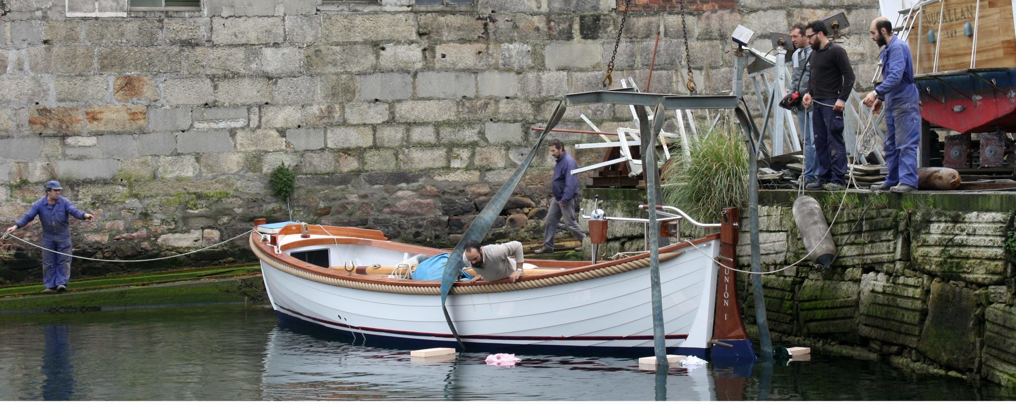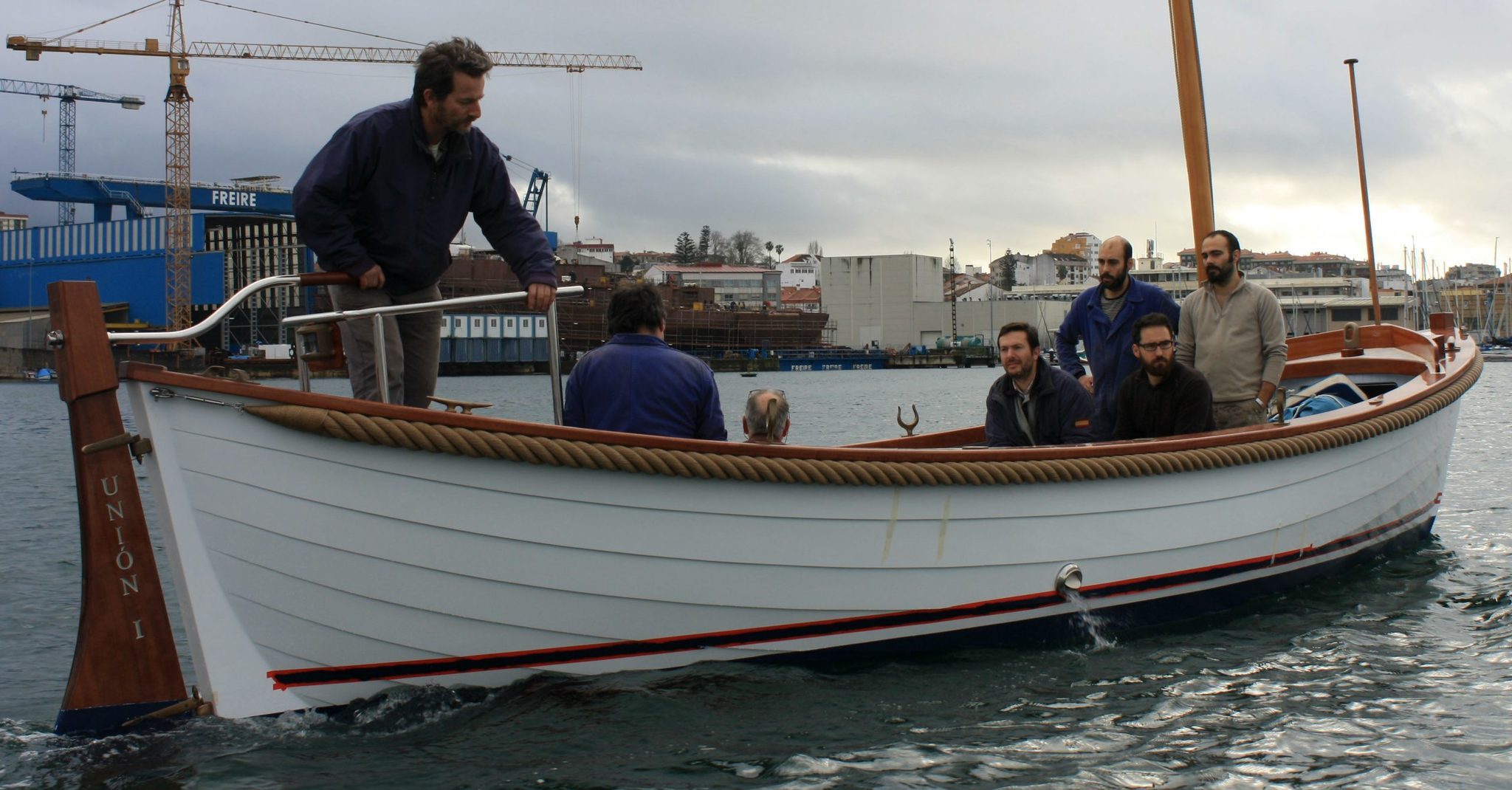 Astilleros Lagos, jueves, 11 de febrero, 16:00 horas. El “Unión I” toca el agua en Bouzas por primera vez, a bordo los siete responsables de la construcción de la ballenera destinada al nuevo buque escuela del Perú. A su lado, una lancha del Liceo Marítimo de Bouzas desde la que el comandante Alfonso Nieto, de la Marina de Guerra del país sudamericano, no pierde detalle de las pruebas de mar.