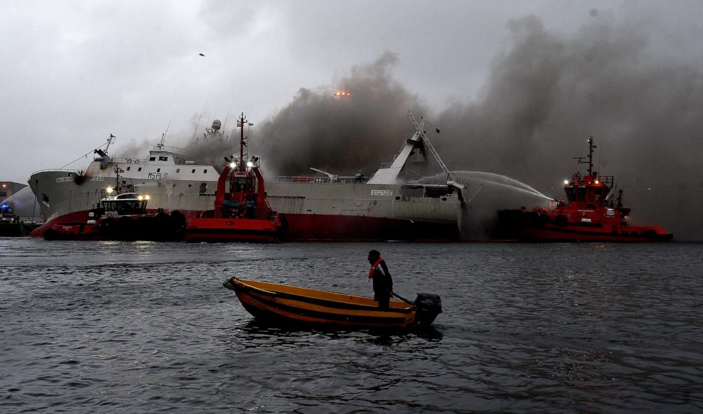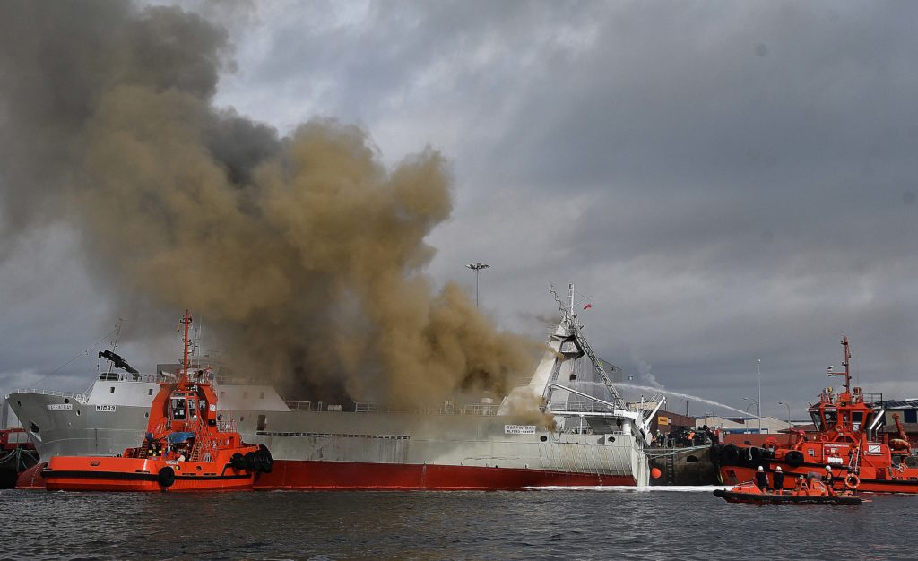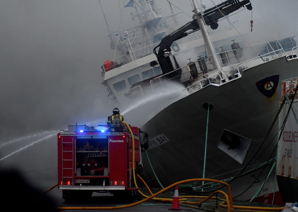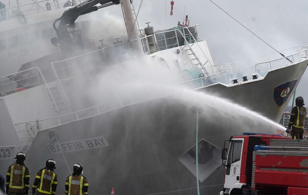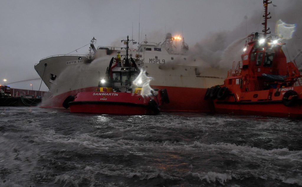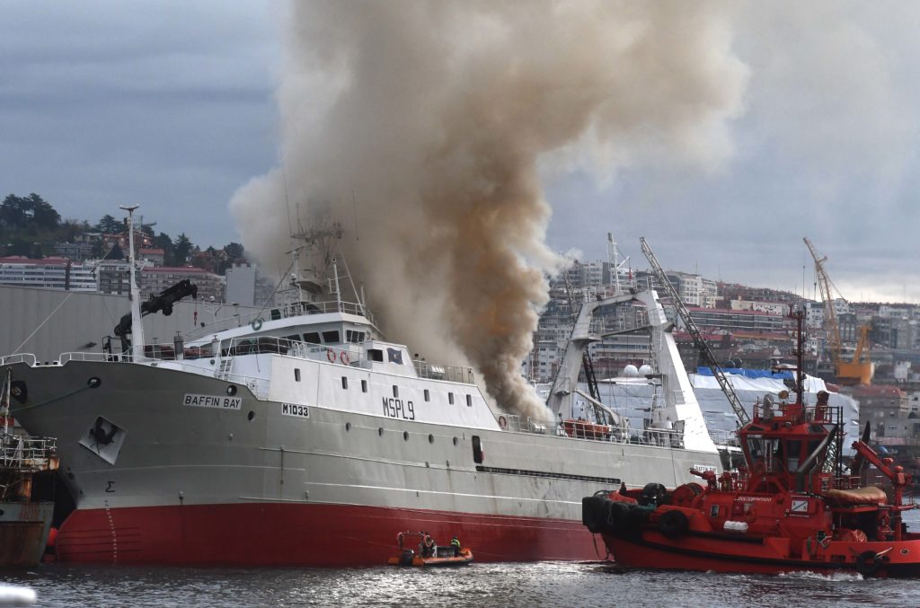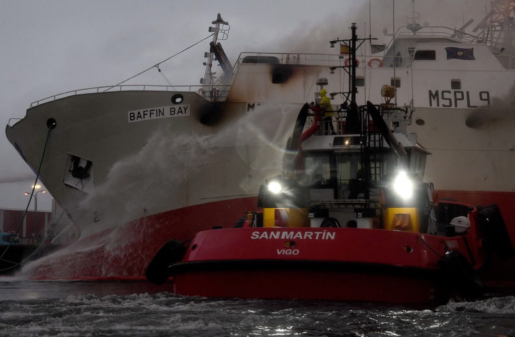 A partir de las 18.30 horas comenzó a caer la noche pero el ‘Baffin Bay’, un arrastrero congelador de la armadora South Atlantic Squid y perteneciente al grupo vigués Copemar, seguía echando humo. Ya sin luz su destino se antojaba negro. Además, las llamas se estaban acercando peligrosamente al depósito de combustible, por lo que se podría provocar su hundimiento intencionado.