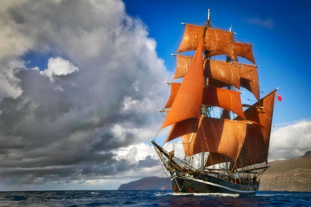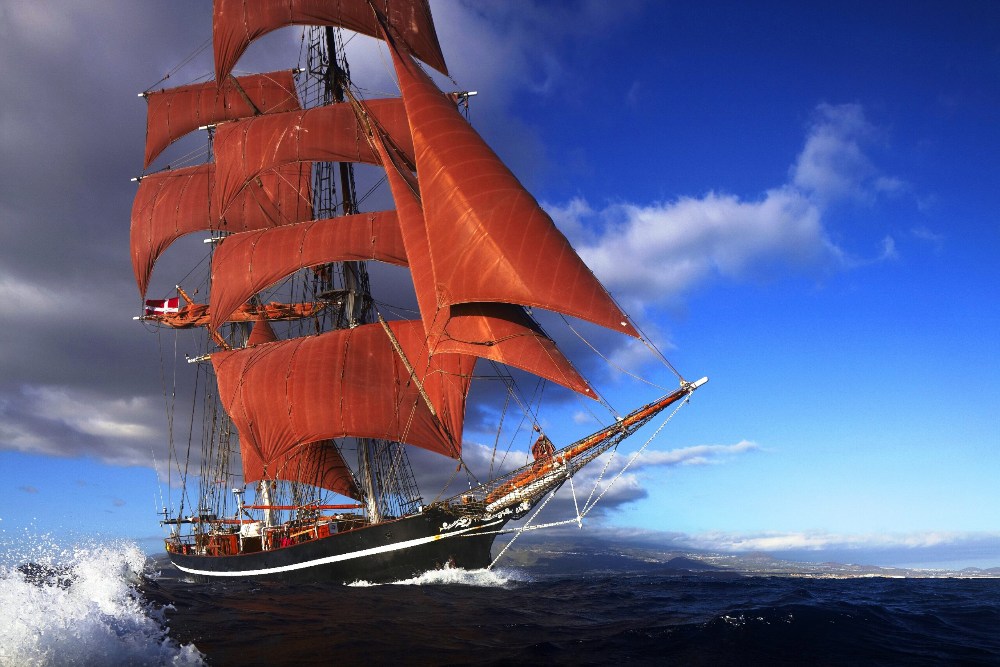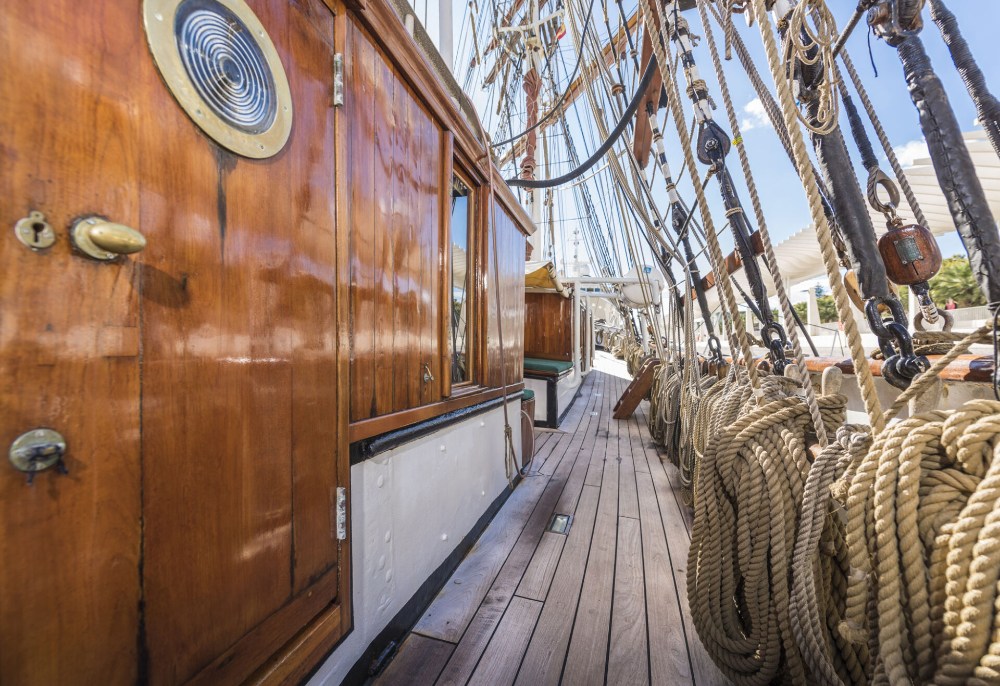 Una de sus señas de identidad más llamativas son sus velas rojas, teñidas con tanino (un conservante natural extraído de cortezas de árbol) que las protege de la humedad y el moho, prolongando su durabilidad en travesías largas. Este tratamiento, heredado de prácticas tradicionales, confiere al buque un aspecto único y fotogénico, que resalta contra el azul del océano o el gris del temporal.