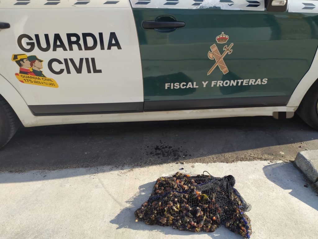 En la playa se incautaron 11 sacos de red que contenían unos 300 kilos de vieiras y en las inmediaciones se localizaron dos bombonas de oxígeno y varios útiles para realizar la práctica del submarinismo, que también fueron intervenidos.