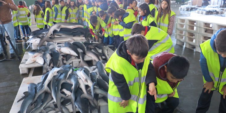 Posteriormente, y debidamente uniformados con chalecos reflectantes de la Autoridad Portuaria, visitaron la Lonja, con escasa actividad a esa hora -11.00-, donde, no obstante,  disfrutaron con las explicaciones de un técnico del Puerto de Vigo, que les mostró varios ejemplares de pez espada.