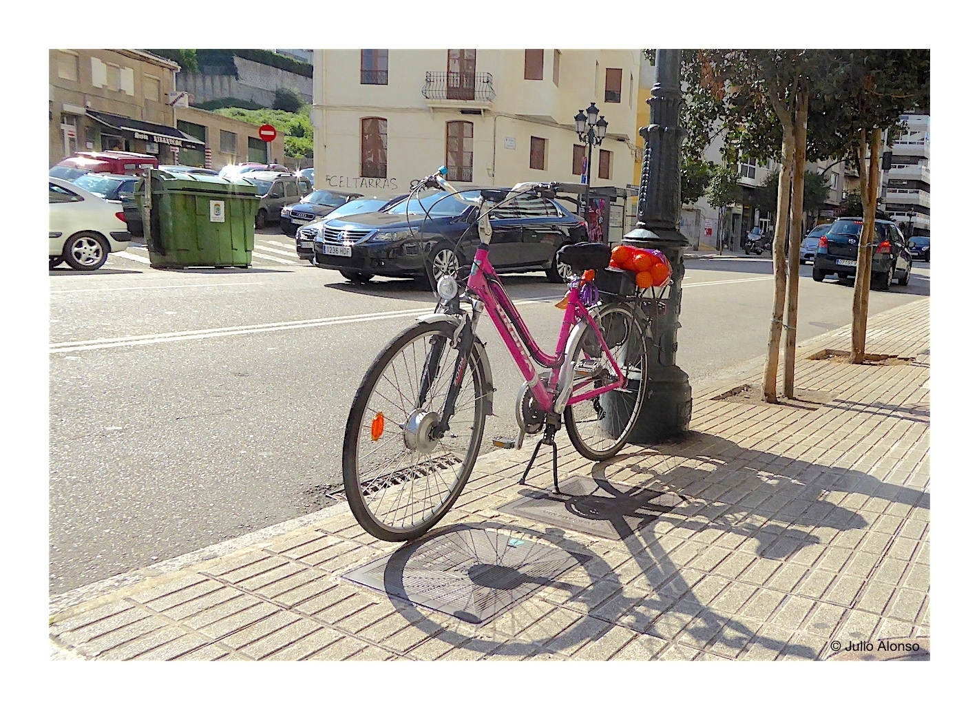 Los precios van bajando hasta límites razonables, y el negocio de la bicicleta se va imponiendo en todas las edades y para todas las necesidades. En la fotografía observamos una bicicleta eléctrica aparcada en una acera. Lleva una bolsa de naranjas en la cestilla, de lo que se deduce que es utilizada, además de pasear, para realizar la compra. Habrá que apuntarse a la tendencia de la bicicleta.