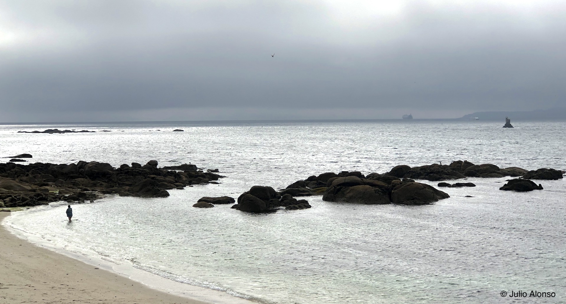 Esta fotografía está tomada en la playa de Os Olmos, en la ciudad de Vigo. Es el atardecer de los primeros días del mes de agosto del año 2020, mucho más templado que el recién terminado mes de julio, soleado y caluroso como nunca se recuerda. La pequeña playa está desierta, salvo una persona que aprovecha la soledad para pasear por la orilla con el agua hasta las rodillas, relajándose. Todo el conjunto favorece la contemplación. Al fondo, la bruma del final de la tarde ocluye la visión de las Islas Cíes mientras un enorme barco de transporte de vehículos abandona la ría por la boca norte, con el barco que vuelve de las Cíes, casi imperceptible, a la derecha. Entre los numerosos detalles también es preciso resaltar una gaviota que vuela alto y distante, en el centro, con las alas en forma de uve, de Vigo.