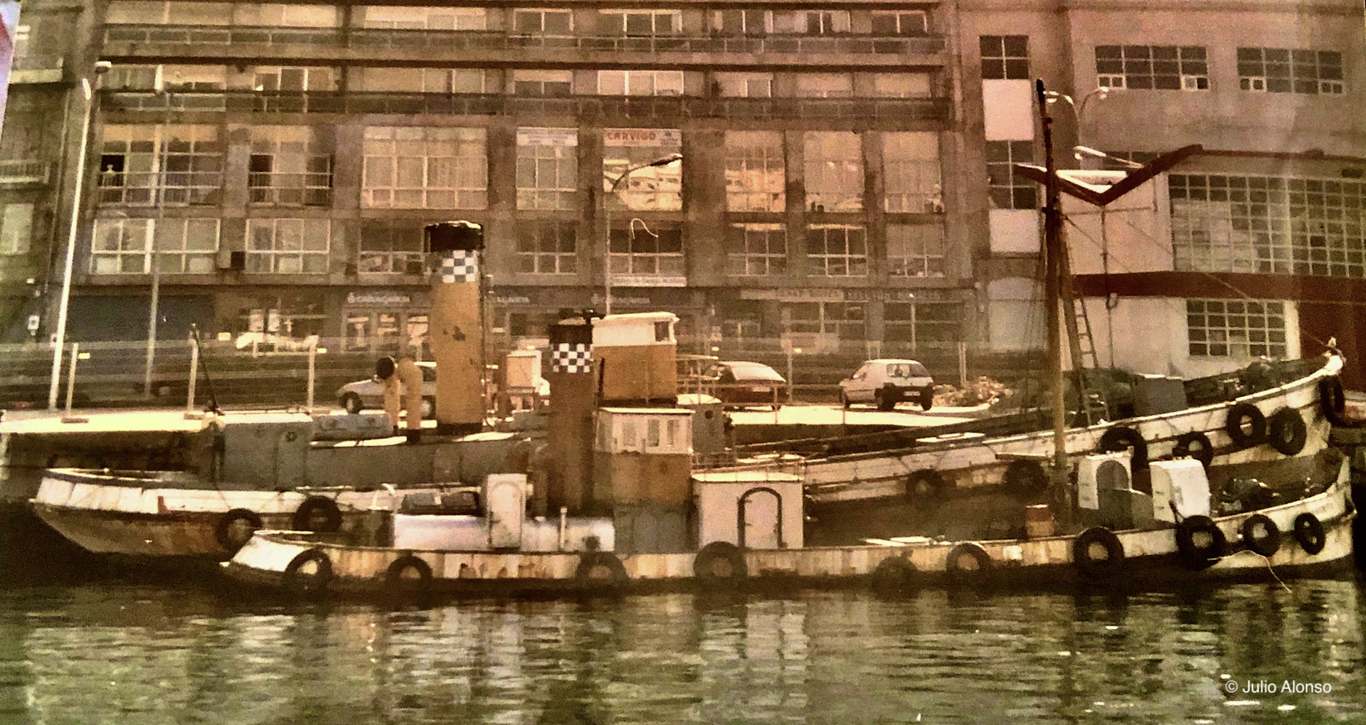 La fotografía está tomada aproximadamente a finales del pasado siglo XX, pero no puedo precisar la fecha pues está realizada sobre celuloide y la copia en papel no lleva impresa la fecha. La imagen está realizada desde el muelle de la Estación Marítima de Vigo, frente a las proximidades del Mercado de O Berbés. Esos dos barcos que están abarloados ya forman parte de la historia de la ciudad de Vigo.