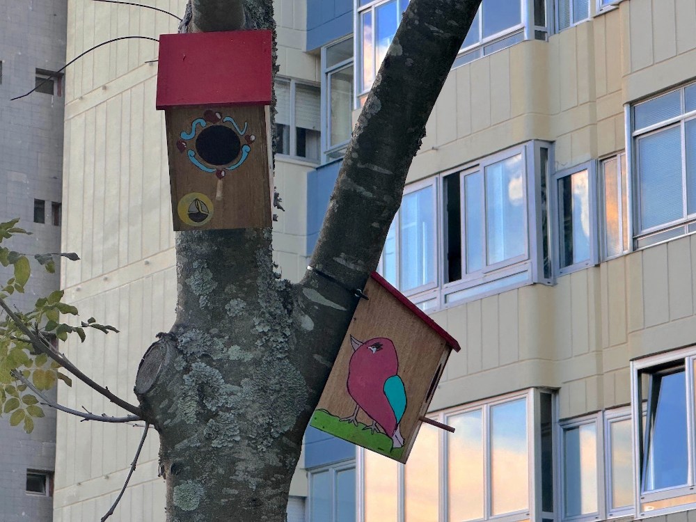 En el vigués barrio de Coia, en una parte del paseo de la Avenida de Castelao, pueden observarse numerosas casetas como la que muestra la fotografía, todas ellas colgadas de las ramas de los árboles. Están proyectadas, sin duda, para dar cobijo a los diferentes pájaros que viven en este espacio público y el tamaño de sus aberturas delimita la entrada de otras aves como palomas, cuervos, urracas -pegas, en gallego-  o gaviotas. Esta acertada idea es, sin duda, un modo de valorar y dinamizar la vida de diferentes animales –en este caso aves- que también coexisten en el parque. Quizá en el futuro también se pueda establecer alguna estructura adecuada para albergar, por ejemplo, ardillas, o algunos insectos inofensivos. Por lo pronto, queda demostrado el amor a los pájaros.