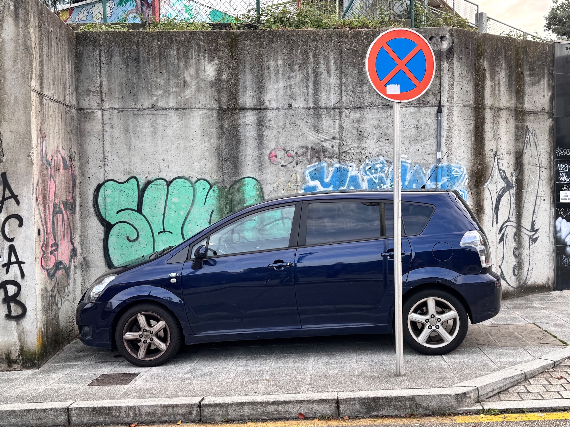 Lo que muestra la fotografía es un aparcamiento arbitrario en la ciudad de Vigo. Realmente no molesta a nadie y el aprovechamiento del espacio aparenta muy ingenioso, incluso admirable, a pesar de esa señal tan elocuente; un mal menor. Sin embargo, en la ciudad de Vigo sí existen situaciones de aparcamiento que resultan totalmente inadmisibles.