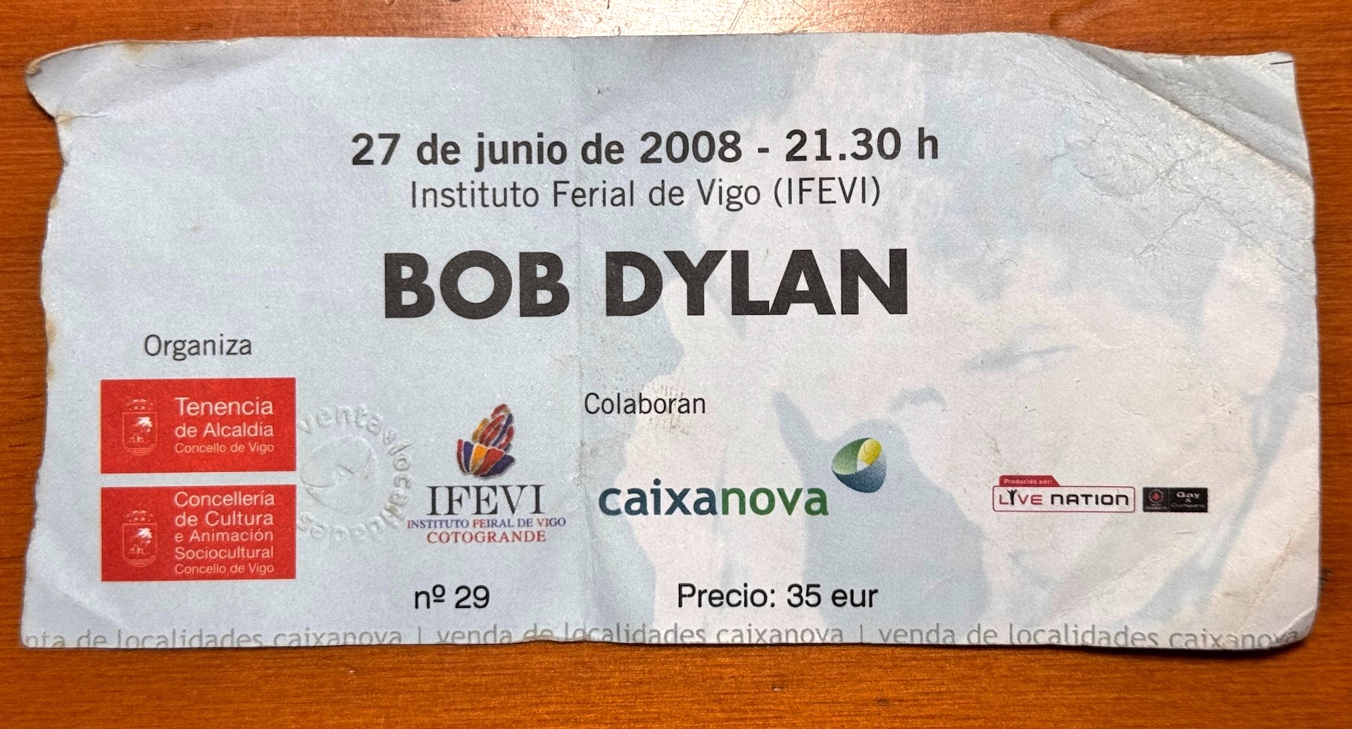 Esta es la entrada que alguien conserva como recuerdo de un concierto histórico en la ciudad de Vigo: Bob Dylan. El acontecimiento tuvo lugar en el IFEVI en el año 2008, cuando Abel Caballero llegó a la alcaldía en coalición con el BNG (Bloque Nacionalista Galego). La singular actuación de Bob Dylan se consiguió gracias a la cooperación entre el Concello de Vigo y la añorada Caixanova, colaboradora indispensable de multitud de iniciativas que engrandecían y beneficiaban a la ciudad y a toda su ciudadanía.