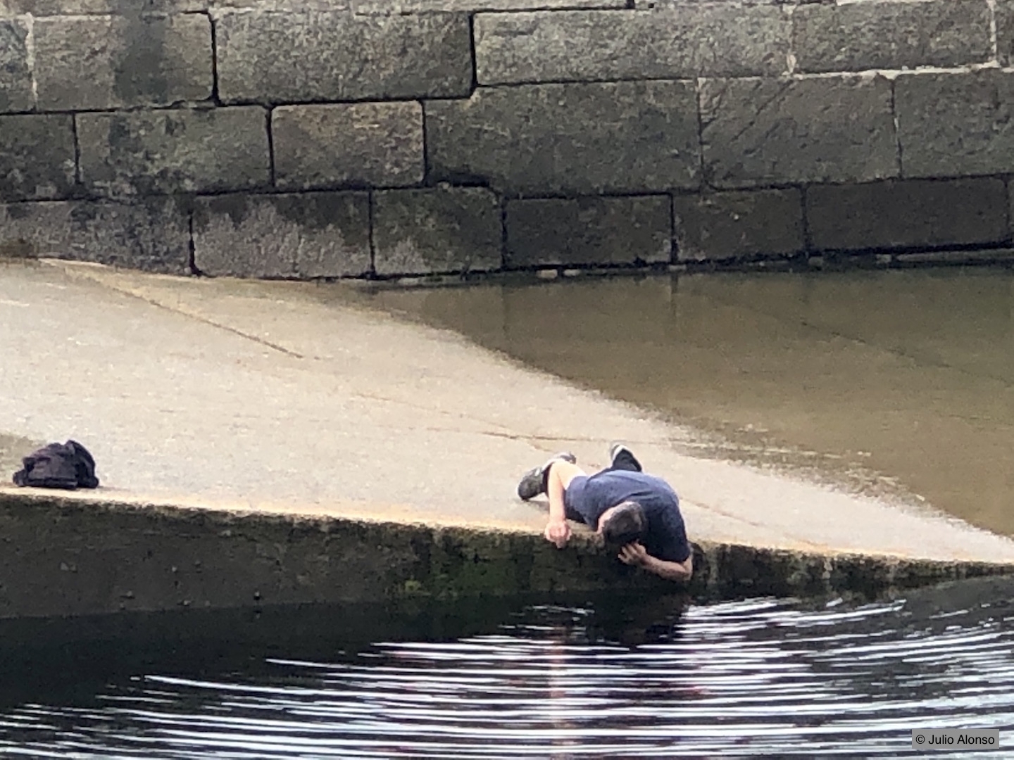 No todo el mundo dispone de casa —aunque lo diga la Constitución— y mucho menos de cuarto de aseo. La fotografía da buena cuenta de ello. Puede observarse a un hombre aseándose con agua del mar en una rampa del puerto de A Coruña. Otros lo hacen en las fuentes públicas. Cada uno de ellos lo hace donde puede y cada día aumenta el número de desahuciados.