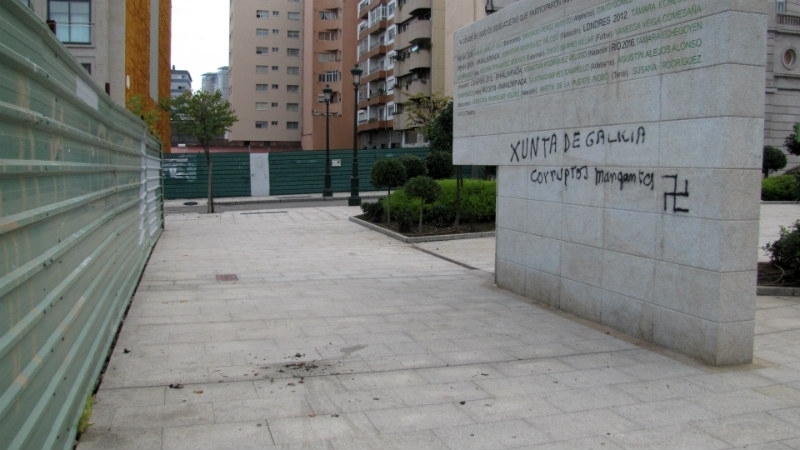Solo han tenido que pasar cinco días para que el Monumento a los Olímpicos y Paralímpicos de Vigo sufriese el primer acto vandálico. Pintadas, insultos, esvástica y tachones en ambas caras aparecieron este martes en la losa tallada con todos los nombres de los deportivas vigueses que han participado en unos Juegos Olímpicos o Paralímpicos. En la zona también hay restos de botellas en el suelo. Un triste estreno para el monumento.