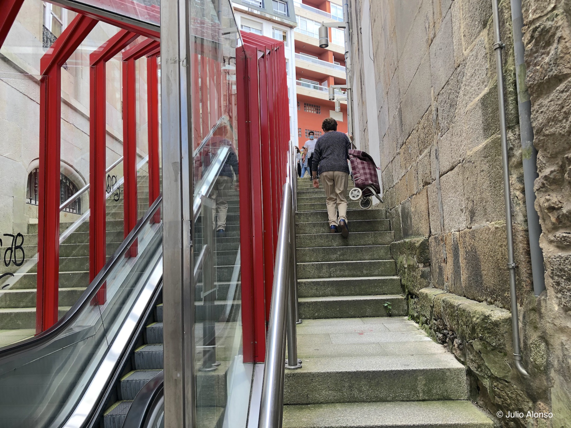 Concretamente, al ascensor que comunica la Avenida das Camelias con la Rúa Menéndez Pelayo, que se avería con mucha frecuencia y las reparaciones, en cambio, se eternizan. En cuanto a las escaleras mecánicas de la Rúa da II República, quizá se arreglen con mayor diligencia, pero el trastorno resulta igual de molesto. En la fotografía, tomada hace unos días, puede observarse a una mujer que se ve obligada a subir las escaleras llevando en peso el carro de la compra. Sobra comentar los trastornos para las personas de cierta edad o con movilidad reducida.