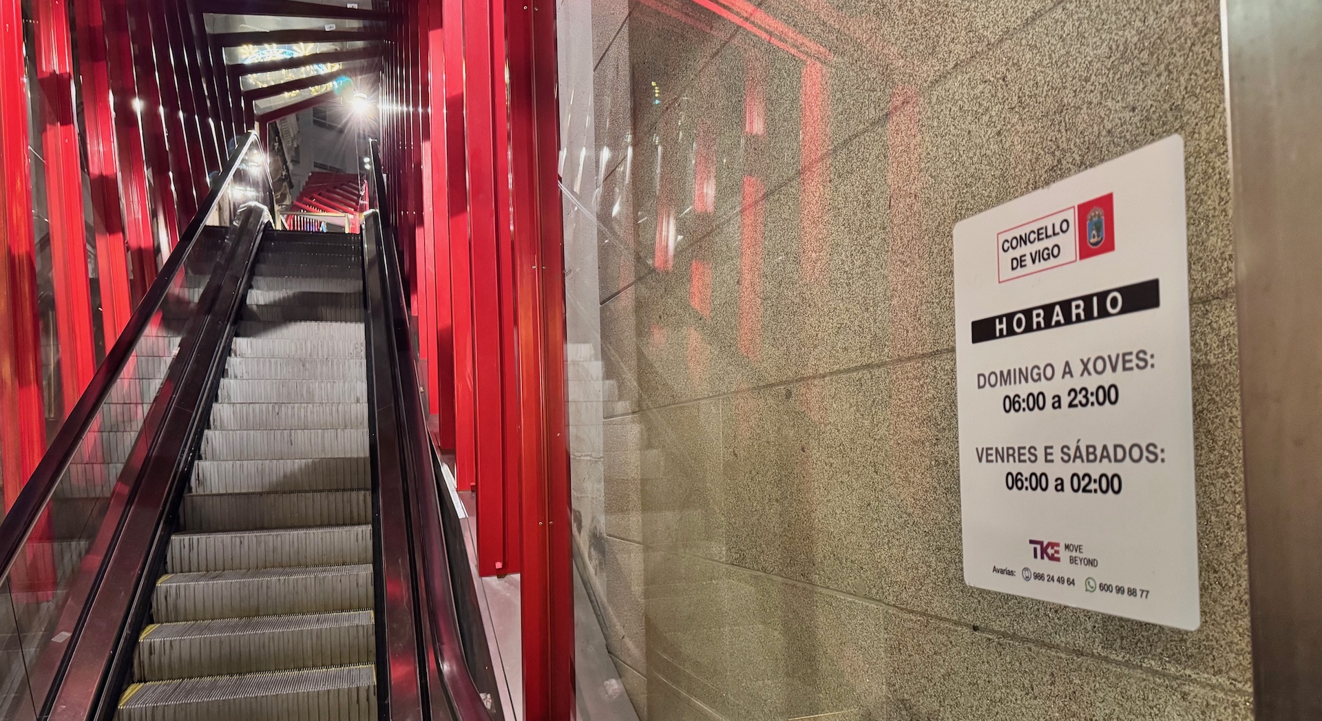 Esta fotografía fue tomada el pasado viernes 26 de diciembre a las doce de la noche. Se trata de las escaleras mecánicas de la Rúa II República, en la ciudad de Vigo, en pleno corazón de la ciudad, en la Porta do Sol. Las escaleras estaban paradas y la gente se veía obligada a subir a pie o a dar un rodeo, aunque el cartel de la derecha dice bien claro que deberían estar funcionando hasta las dos de la madrugada.