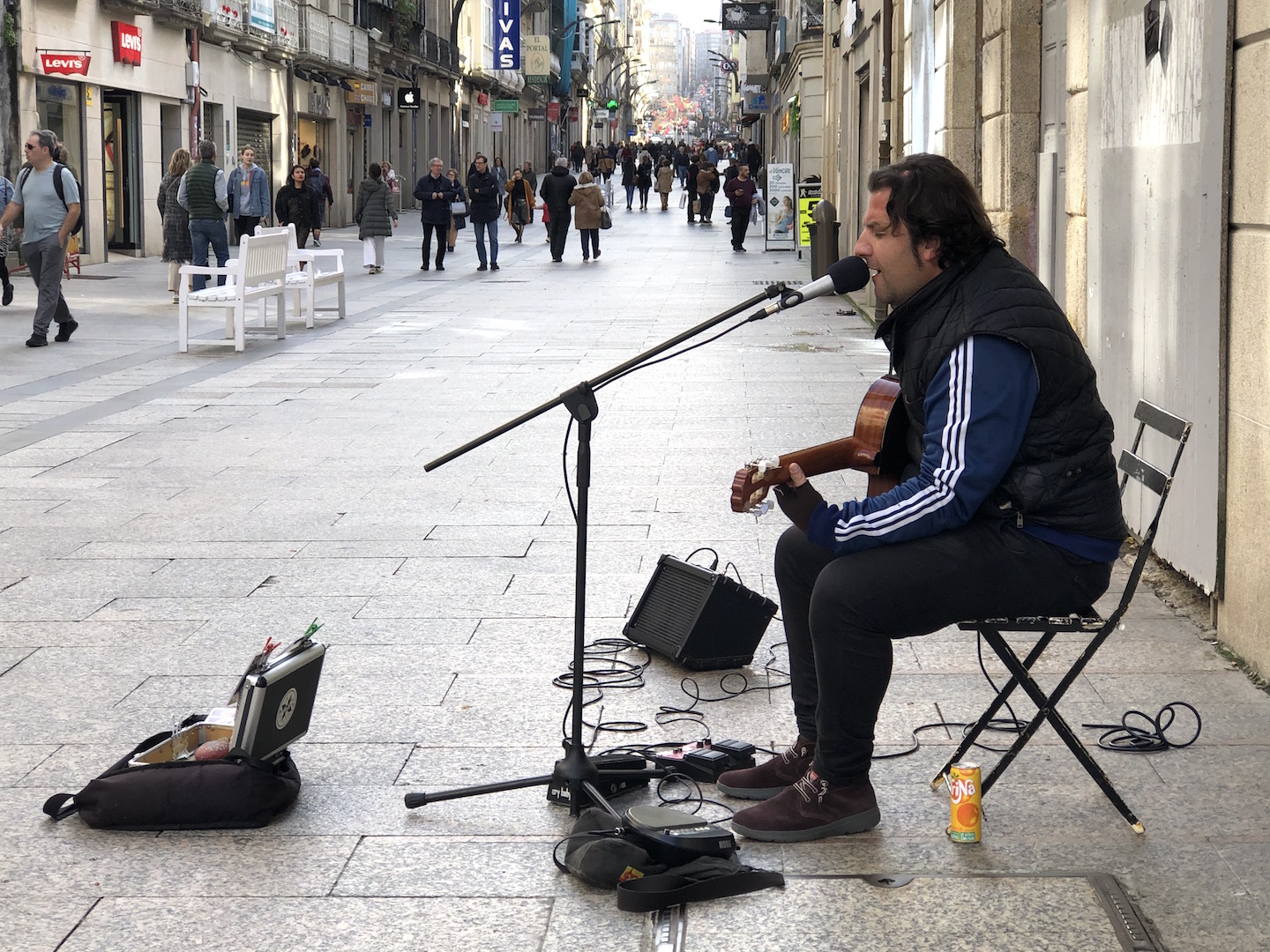 Este hombre es uno de los músicos callejeros que ponen la banda sonora en la Rúa do Príncipe de la ciudad de Vigo, la más comercial y concurrida. Interpreta el blues de una manera muy agradable, pero no es el único que deleita el paseo con su música.